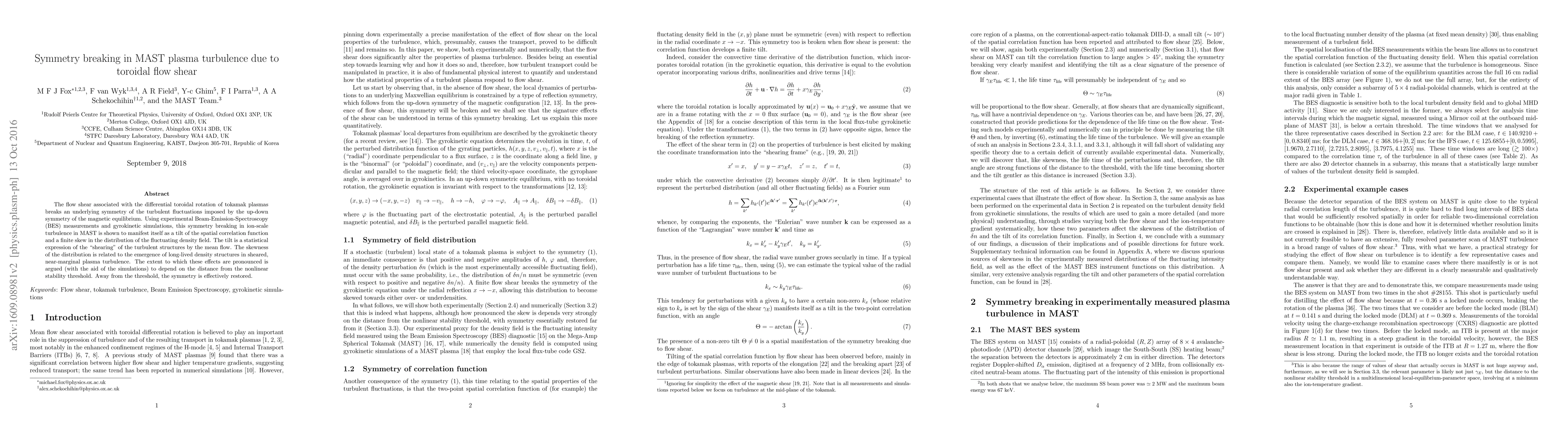 This paper investigates how toroidal flow shear in MAST plasma turbulence breaks the inherent symmetry of turbulent fluctuations, leading to a tilt in the spatial correlation function and skewness in the fluctuating density field. Experimental and simulation results suggest these effects are most pronounced near the nonlinear stability threshold.
