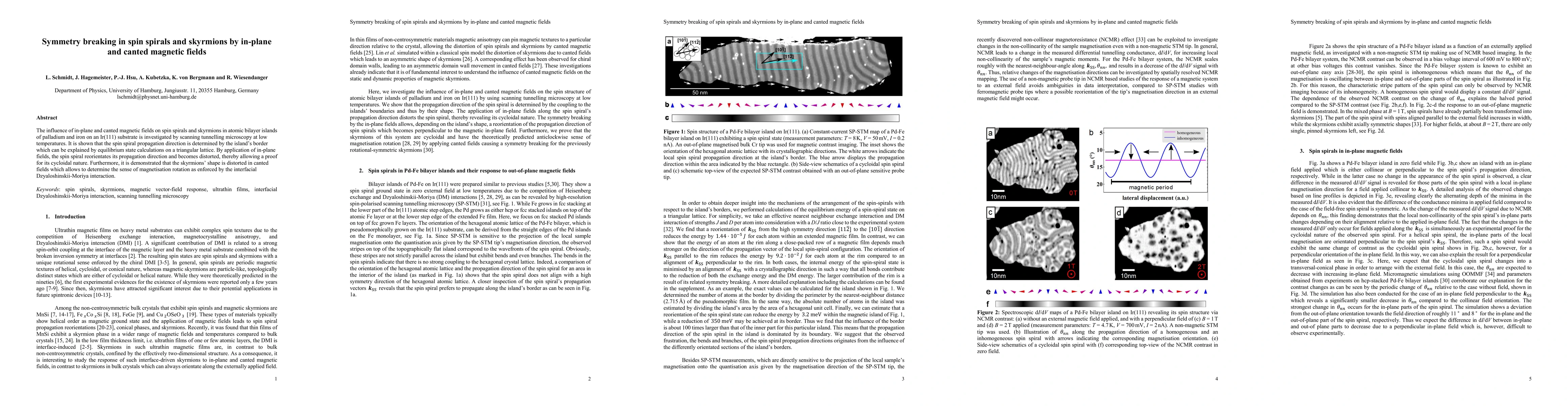 The influence of in-plane and canted magnetic fields on spin spirals and skyrmions in atomic bilayer islands of palladium and iron on an Ir(111) substrate is investigated by scanning tunnelling microscopy at low temperatures. It is shown that the spin spiral propagation direction is determined by the island's border which can be explained by equilibrium state calculations on a triangular lattice. By application of in-plane fields, the spin spiral reorientates its propagation direction and becomes distorted, thereby allowing a proof for its cycloidal nature. Furthermore, it is demonstrated that the skyrmions' shape is distorted in canted fields which allows to determine the sense of magnetisation rotation as enforced by the interfacial Dzyaloshinskii-Moriya interaction.