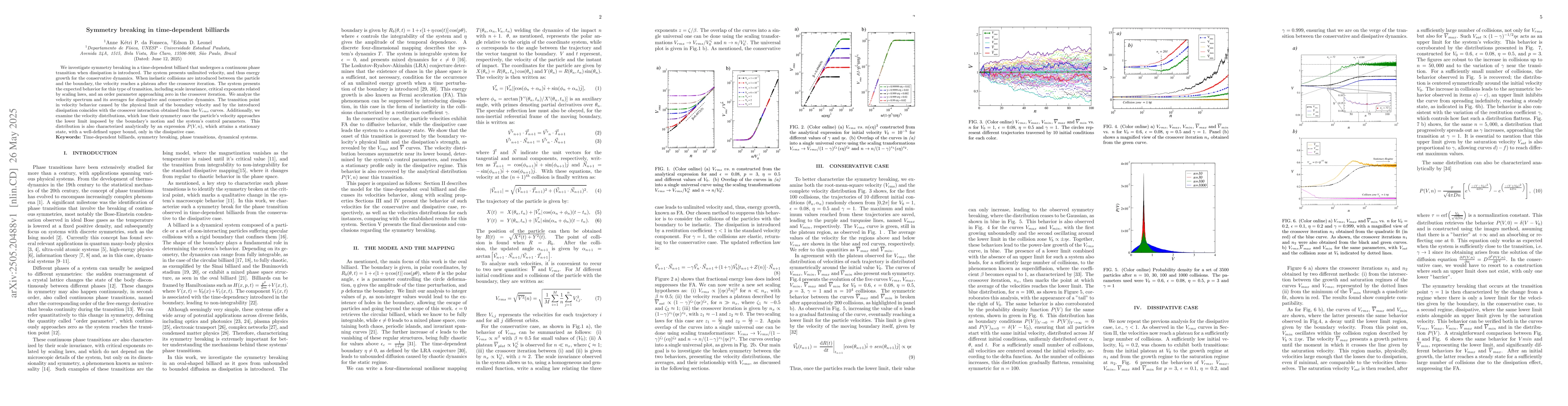 The paper presents a detailed analysis of symmetry breaking in time-dependent billiards undergoing phase transitions due to dissipation, providing insights into velocity spectra, averages, and distributions, along with an analytical expression for velocity distribution.