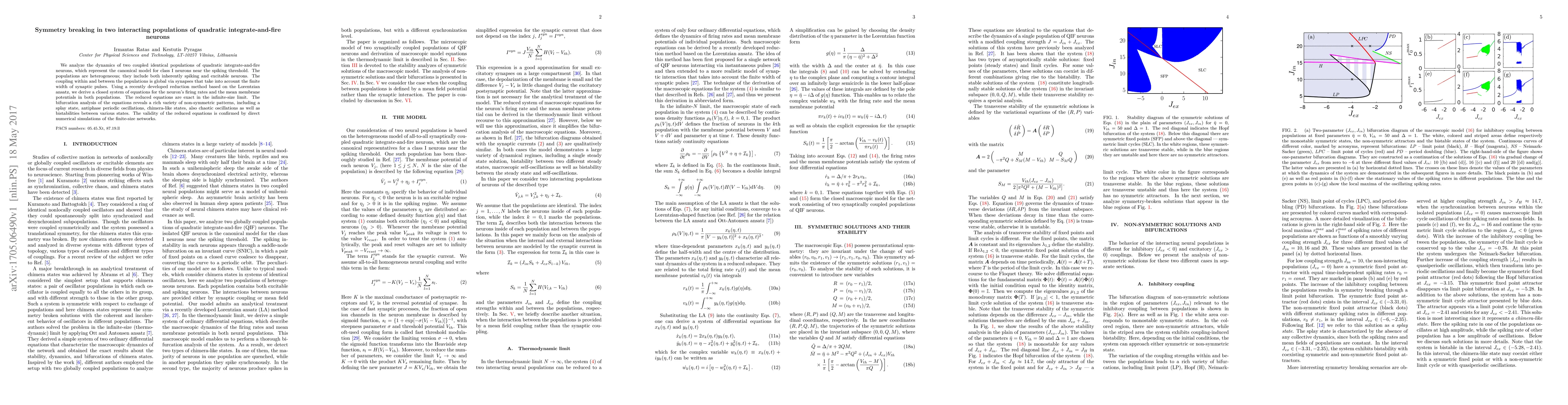 This paper investigates the dynamics of two coupled populations of quadratic integrate-and-fire neurons, revealing a variety of non-symmetric patterns through bifurcation analysis. The study uses a reduction method to derive exact equations in the infinite-size limit, validated by simulations of finite-size networks.