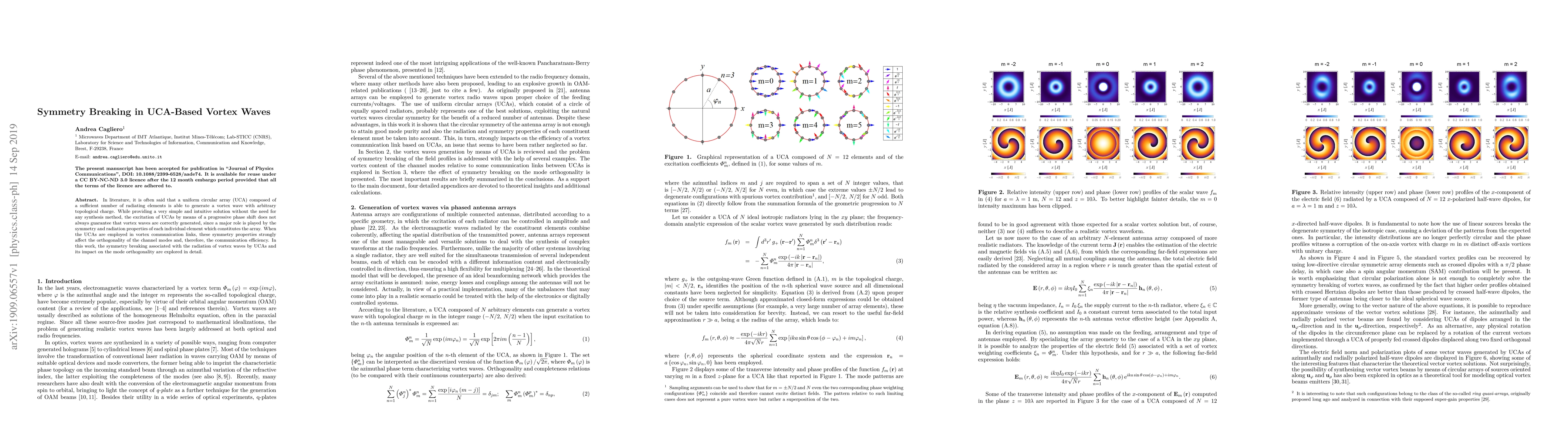 In literature, it is often said that a uniform circular array (UCA) composed of a sufficient number of radiating elements is able to generate a vortex wave with arbitrary topological charge. While providing a very simple and intuitive solution without the need for any synthesis method, the excitation of UCAs by means of a progressive phase shift does not always guarantee that vortex waves are correctly generated, since a major role is played by the symmetry and radiation properties of each individual element which constitutes the array. When the UCAs are employed in vortex communication links, these symmetry properties strongly affect the orthogonality of the channel modes and, therefore, the communication efficiency. In this work, the symmetry breaking associated with the radiation of vortex waves by UCAs and its impact on the mode orthogonality are explored in detail.