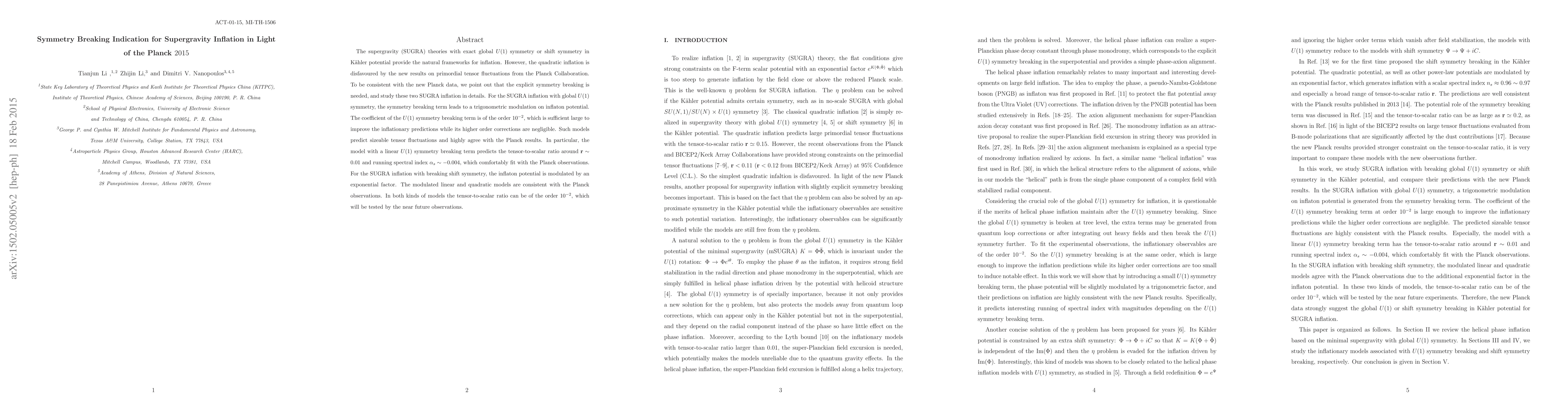 This paper investigates supergravity inflation models with symmetry breaking to align with the Planck 2015 results. It finds that explicit symmetry breaking in SUGRA frameworks, either through $U(1)$ symmetry or shift symmetry, leads to improved inflationary predictions and sizeable tensor fluctuations, consistent with observed data.