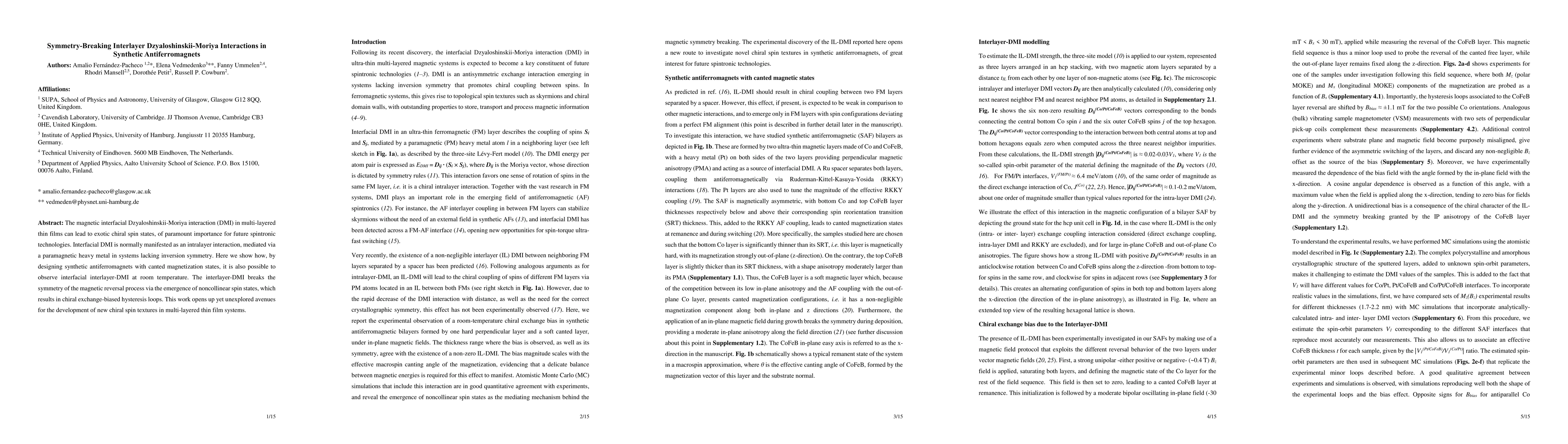 This paper explores symmetry-breaking interlayer Dzyaloshinskii-Moriya interactions in synthetic antiferromagnets, demonstrating their occurrence at room temperature through the design of canted magnetization states. This interlayer DMI induces noncollinear spin states and chiral exchange-biased hysteresis loops, paving the way for novel chiral spin textures in multi-layered thin film systems.