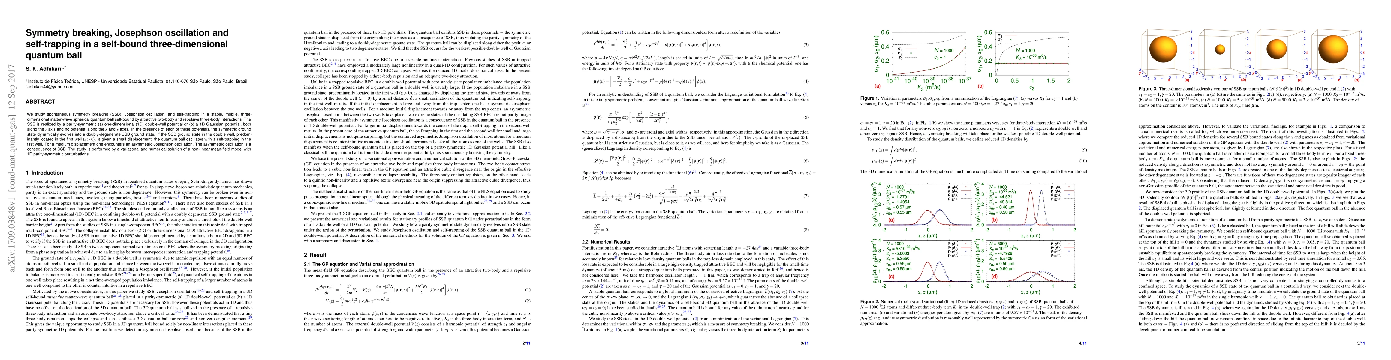 This paper investigates spontaneous symmetry breaking, Josephson oscillations, and self-trapping in a three-dimensional quantum ball, revealing how a symmetric ground state evolves into a doubly-degenerate state under 1D potentials, leading to oscillations and asymmetric Josephson behavior. The study employs variational and numerical methods to solve a non-linear mean-field model.