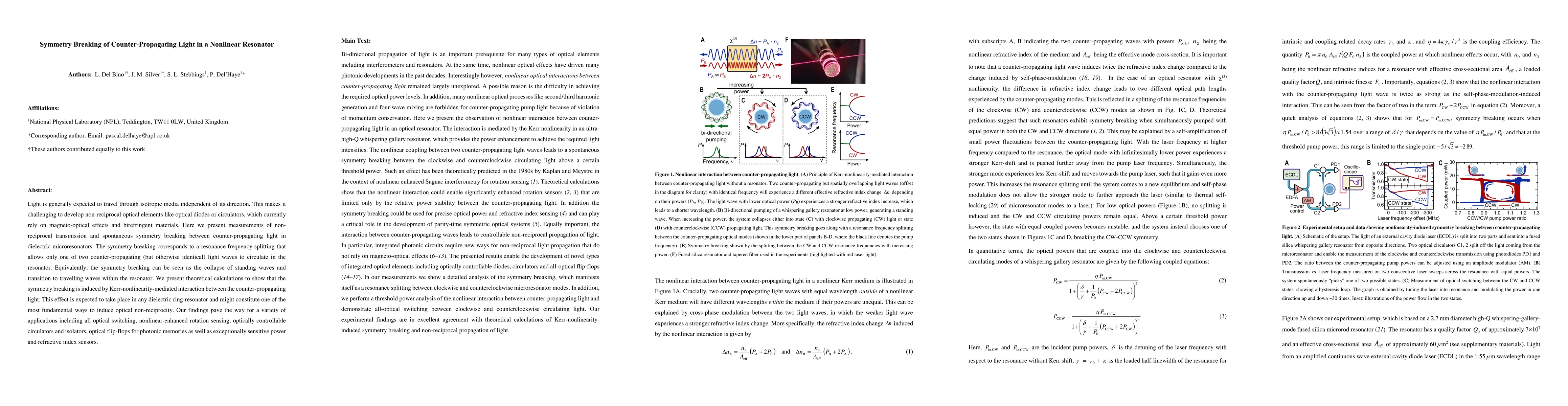 Light is generally expected to travel through isotropic media independent of its direction. This makes it challenging to develop non-reciprocal optical elements like optical diodes or circulators, which currently rely on magneto-optical effects and birefringent materials. Here we present measurements of non-reciprocal transmission and spontaneous symmetry breaking between counter-propagating light in dielectric microresonators. The symmetry breaking corresponds to a resonance frequency splitting that allows only one of two counter-propagating (but otherwise identical) light waves to circulate in the resonator. Equivalently, the symmetry breaking can be seen as the collapse of standing waves and transition to travelling waves within the resonator. We present theoretical calculations to show that the symmetry breaking is induced by Kerr-nonlinearity-mediated interaction between the counter-propagating light. This effect is expected to take place in any dielectric ring-resonator and might constitute one of the most fundamental ways to induce optical non-reciprocity. Our findings pave the way for a variety of applications including all optical switching, nonlinear-enhanced rotation sensing, optically controllable circulators and isolators, optical flip-flops for photonic memories as well as exceptionally sensitive power and refractive index sensors.