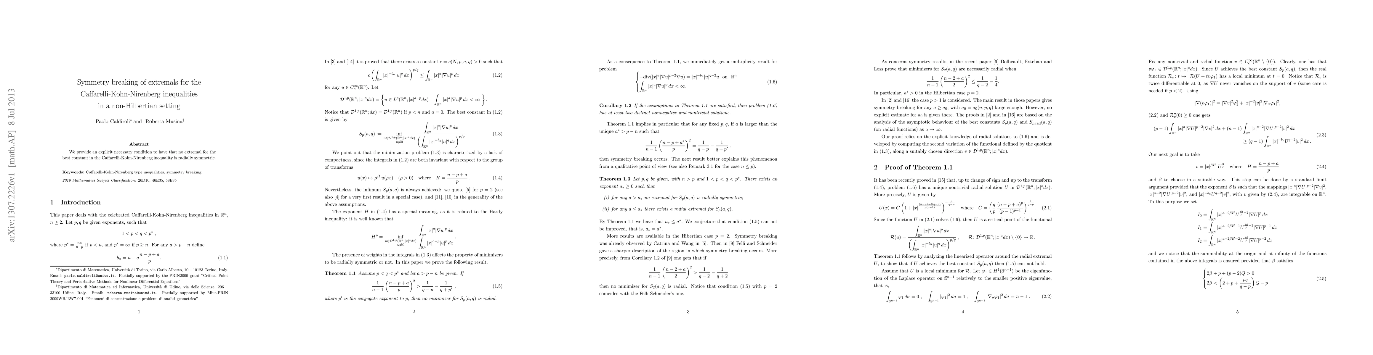 We provide an explicit necessary condition to have that no extremal for the best constant in the Caffarelli-Kohn-Nirenberg inequality is radially symmetric.