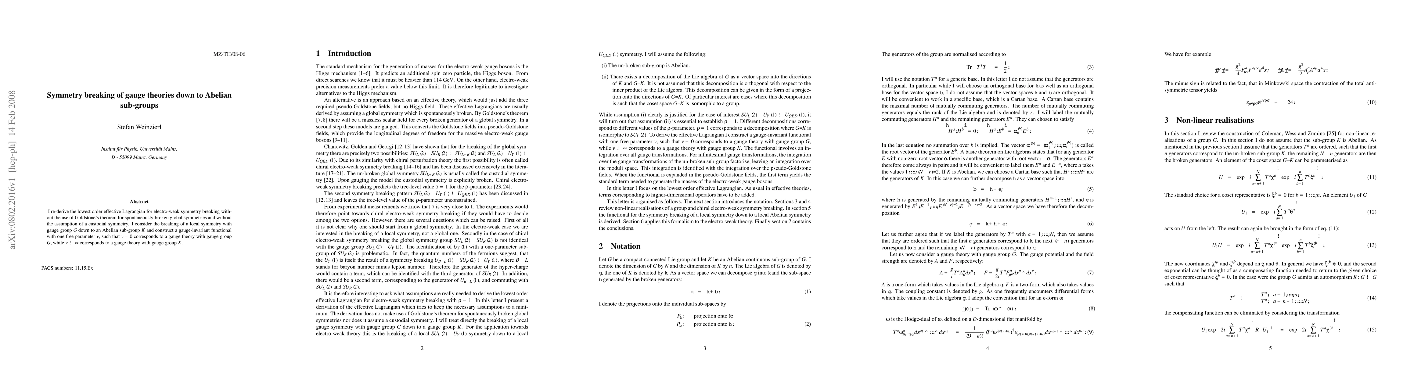 I re-derive the lowest order effective Lagrangian for electro-weak symmetry breaking without the use of Goldstone's theorem for spontaneously broken global symmetries and without the assumption of a custodial symmetry. I consider the breaking of a local symmetry with gauge group G down to an Abelian sub-group K and construct a gauge-invariant functional with one free parameter v, such that v=0 corresponds to a gauge theory with gauge group G, while v --> infinity corresponds to a gauge theory with gauge group K.