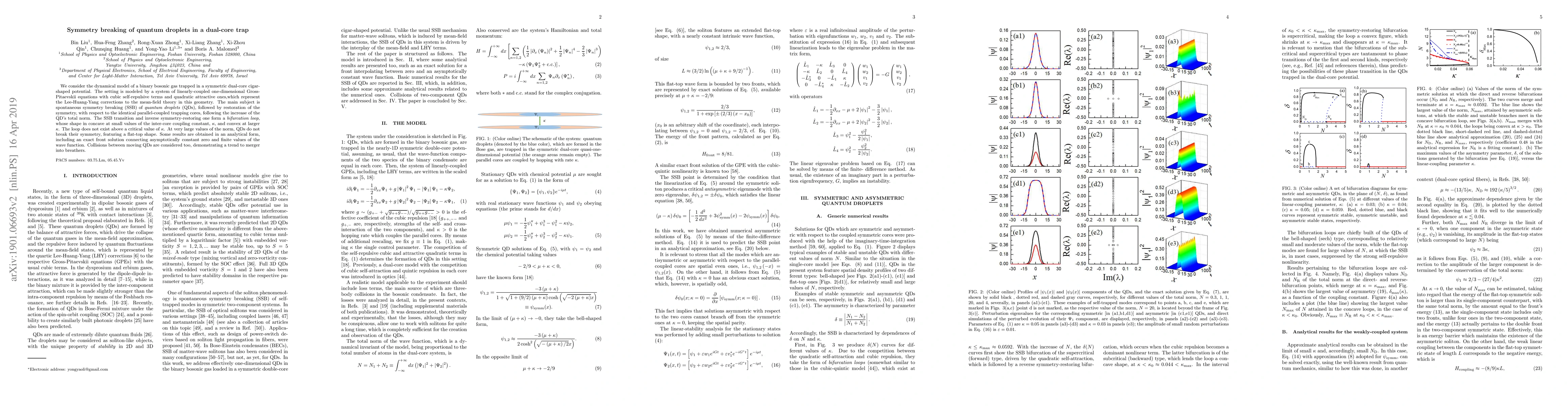 Researchers studied the behavior of quantum droplets in a dual-core trap, finding a symmetry-breaking transition followed by restoration, with a bifurcation loop that depends on the inter-core coupling constant, and considering how it affects their shape and interactions.