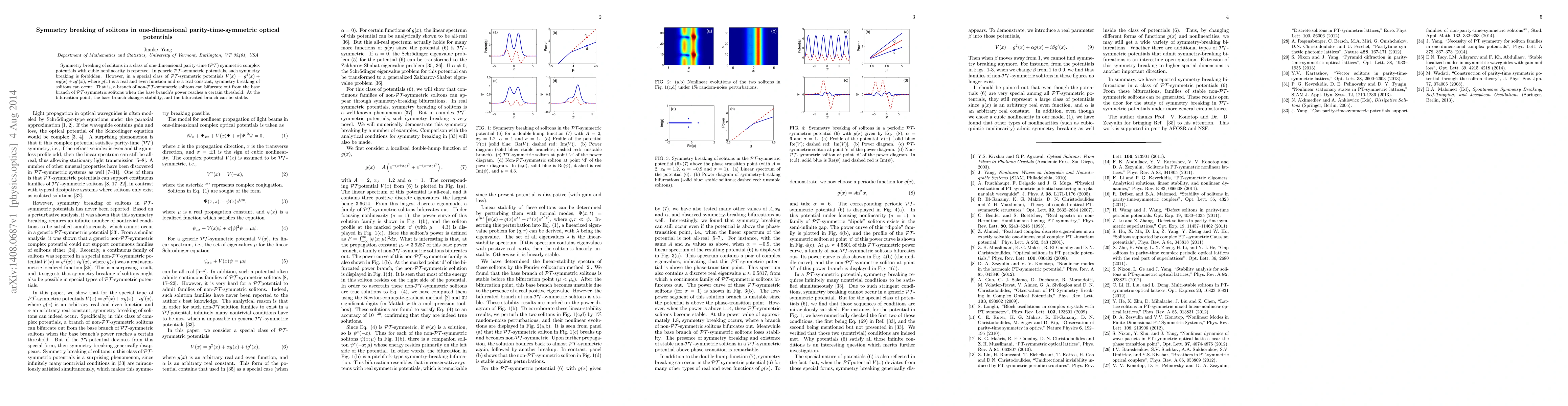 This paper reports the symmetry breaking of solitons in specific one-dimensional parity-time symmetric optical potentials with cubic nonlinearity, where a non-PT-symmetric soliton branch bifurcates from the PT-symmetric branch upon reaching a threshold power, marking a change in stability at the bifurcation point.