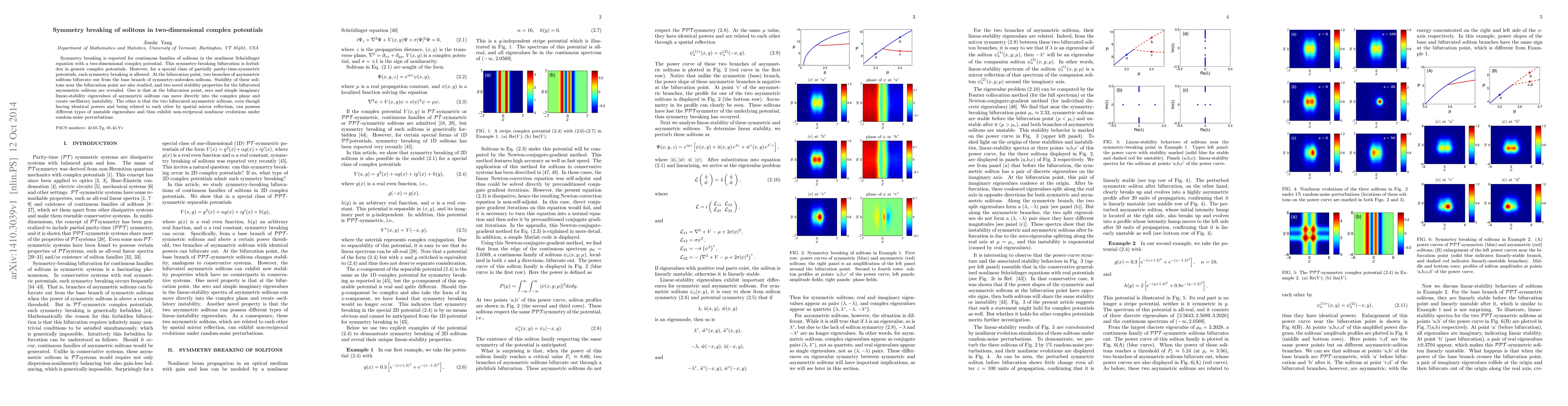 This paper reports symmetry breaking in solitons within the nonlinear Schrödinger equation under two-dimensional complex potentials, revealing bifurcation into asymmetric solitons from symmetric ones in specific partially parity-time-symmetric potentials. Stability analysis uncovers unique instability properties and non-reciprocal evolutions for bifurcated asymmetric solitons.