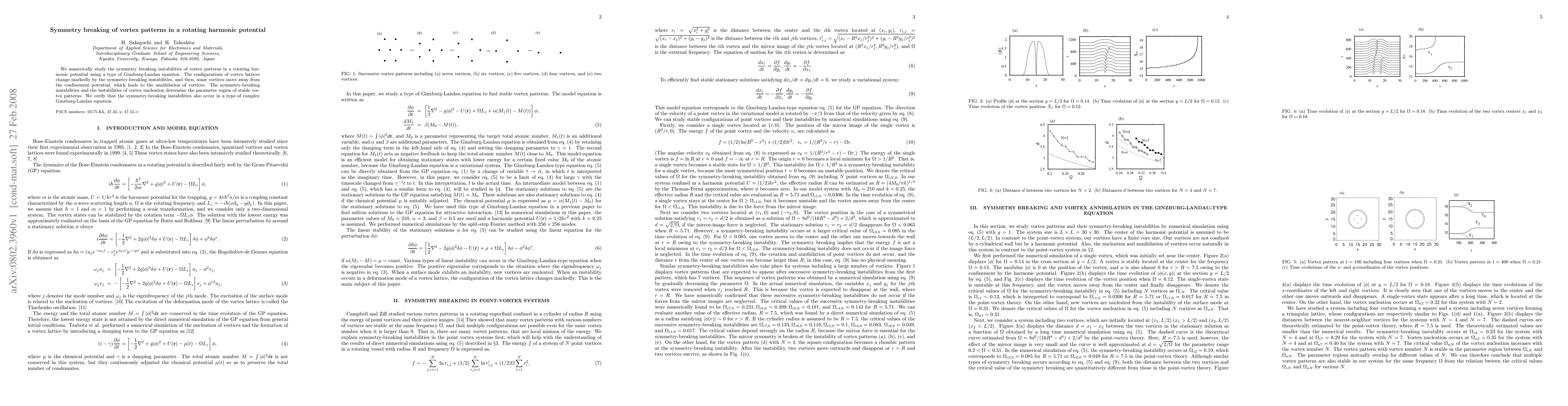 We numerically study the symmetry breaking instabilities of vortex patterns in a rotating harmonic potential using a type of Ginzburg-Landau equation. The configurations of vortex lattices change markedly by the symmetry-breaking instabilities, and then, some vortices move away from the confinement potential, which leads to the annihilation of vortices. The symmetry-breaking instabilities and the instabilities of vortex nucleation determine the parameter region of stable vortex patterns. We verify that the symmetry-breaking instabilities also occur in a type of complex Ginzburg-Landau equation.