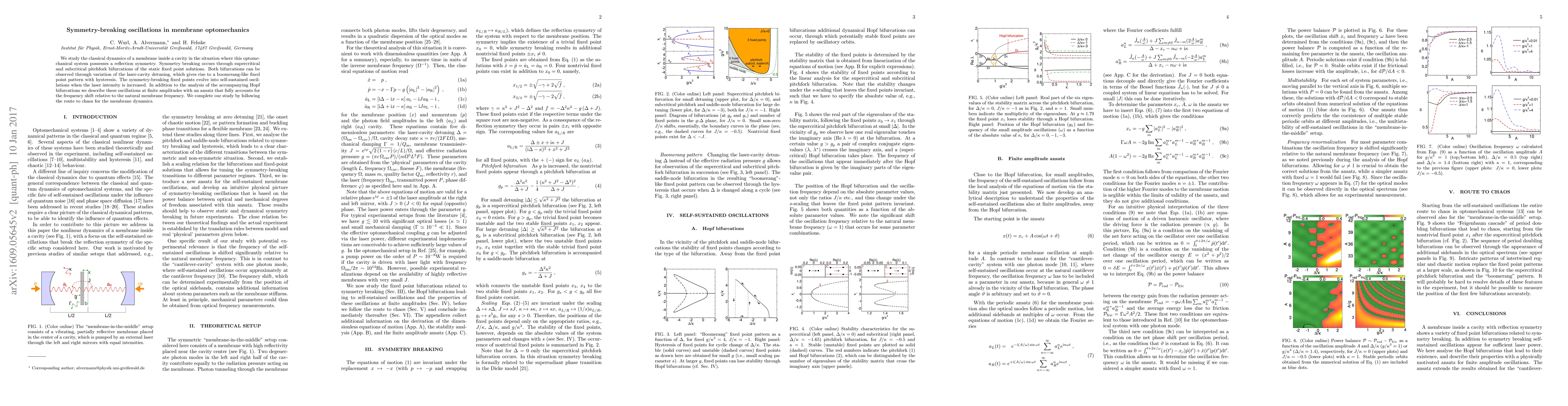 We study the classical dynamics of a membrane inside a cavity in the situation where this optomechanical system possesses a reflection symmetry. Symmetry breaking occurs through supercritical and subcritical pitchfork bifurcations of the static fixed point solutions. Both bifurcations can be observed through variation of the laser-cavity detuning, which gives rise to a boomerang-like fixed point pattern with hysteresis. The symmetry-breaking fixed points evolve into self-sustained oscillations when the laser intensity is increased. In addition to the analysis of the accompanying Hopf bifurcations we describe these oscillations at finite amplitudes with an ansatz that fully accounts for the frequency shift relative to the natural membrane frequency. We complete our study by following the route to chaos for the membrane dynamics.