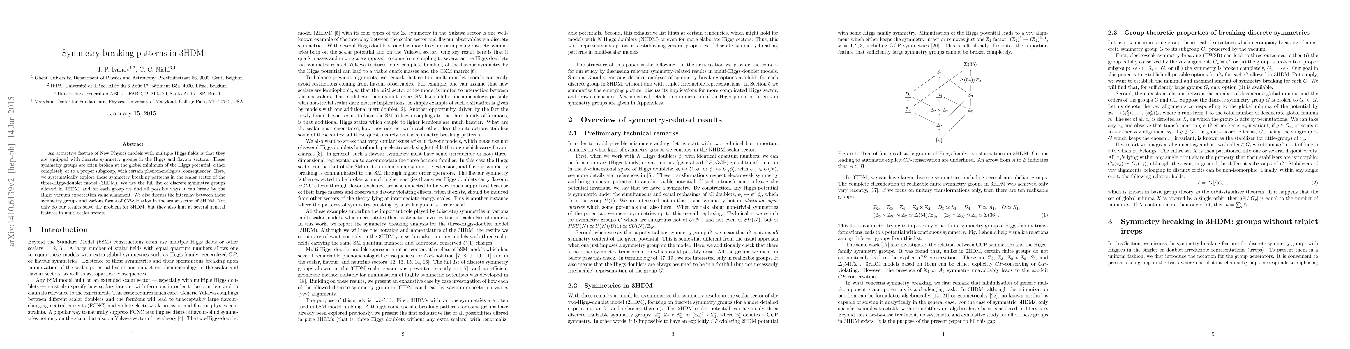 An attractive feature of New Physics models with multiple Higgs fields is that they are equipped with discrete symmetry groups in the Higgs and flavour sectors. These symmetry groups are often broken at the global minimum of the Higgs potential, either completely or to a proper subgroup, with certain phenomenological consequences. Here, we systematically explore these symmetry breaking patterns in the scalar sector of the three-Higgs-doublet model (3HDM). We use the full list of discrete symmetry groups allowed in 3HDM, and for each group we find all possible ways it can break by the Higgs vacuum expectation value alignment. We also discuss the interplay between these symmetry groups and various forms of CP-violation in the scalar sector of 3HDM. Not only do our results solve the problem for 3HDM, but they also hint at several general features in multi-scalar sectors.