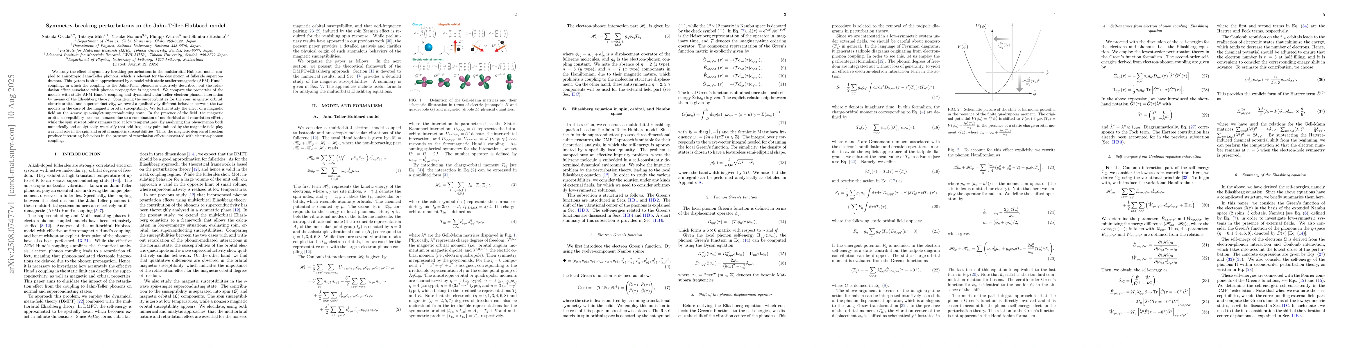 We study the effect of symmetry-breaking perturbations in the multiorbital Hubbard model coupled to anisotropic Jahn-Teller phonons, which is relevant for the description of fulleride superconductors. This system is often approximated by a model with static antiferromagnetic (AFM) Hund's coupling, in which the coupling to the Jahn-Teller phonon is effectively described, but the retardation effect associated with phonon propagation is neglected. We compare the properties of the models with static AFM Hund's coupling and dynamical Jahn-Teller electron-phonon interaction by means of the Eliashberg theory. Considering the susceptibilities for the spin, magnetic orbital, electric orbital, and superconductivity, we reveal a qualitatively different behavior between the two models in the case of the magnetic orbital susceptibility. We further study the effect of a magnetic field on the $s$-wave spin-singlet superconducting state. In the presence of the field, the magnetic orbital susceptibility becomes nonzero due to a combination of multiorbital and retardation effects, while the spin susceptibility remains zero at low temperatures. By analyzing this phenomenon both numerically and analytically, we clarify that odd-frequency pairs induced by the magnetic field play a crucial role in the spin and orbital magnetic susceptibilities. Thus, the magnetic degrees of freedom produce interesting behaviors in the presence of retardation effects associated with electron-phonon coupling.