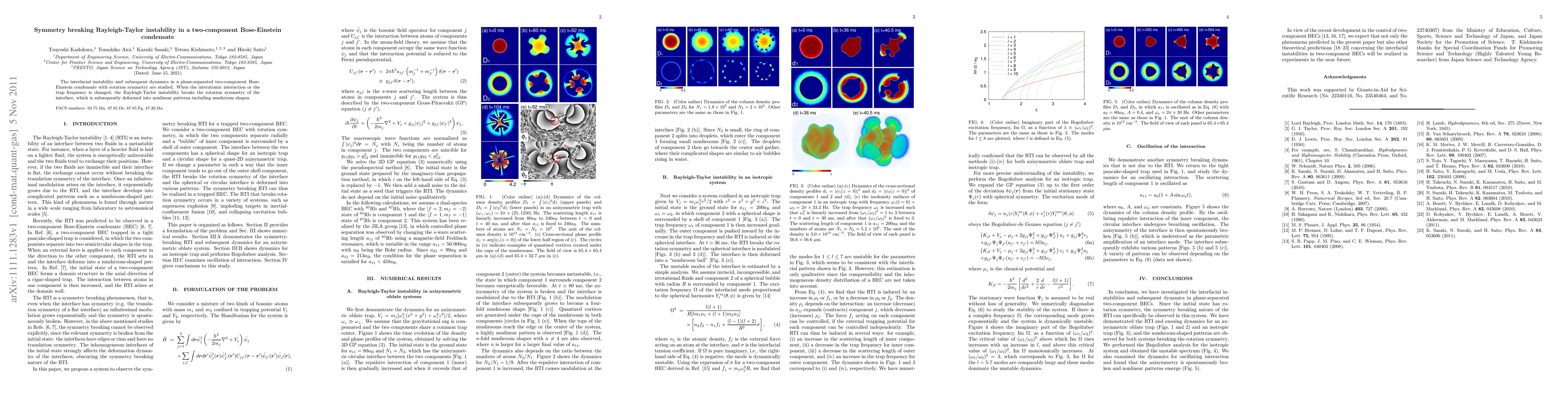 The interfacial instability and subsequent dynamics in a phase-separated two-component Bose-Einstein condensate with rotation symmetry are studied. When the interatomic interaction or the trap frequency is changed, the Rayleigh-Taylor instability breaks the rotation symmetry of the interface, which is subsequently deformed into nonlinear patterns including mushroom shapes.