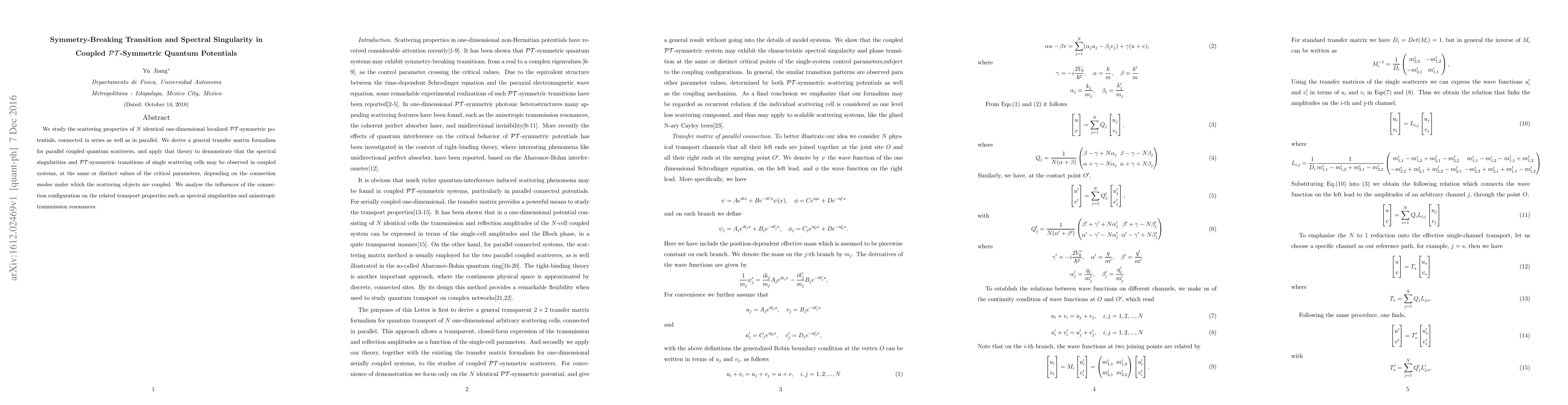 This paper investigates the scattering properties of coupled $\mathcal{PT}$-symmetric quantum potentials, deriving a transfer matrix formalism to show that spectral singularities and symmetry-breaking transitions can occur in series and parallel configurations, influencing transport properties like anisotropic transmission.