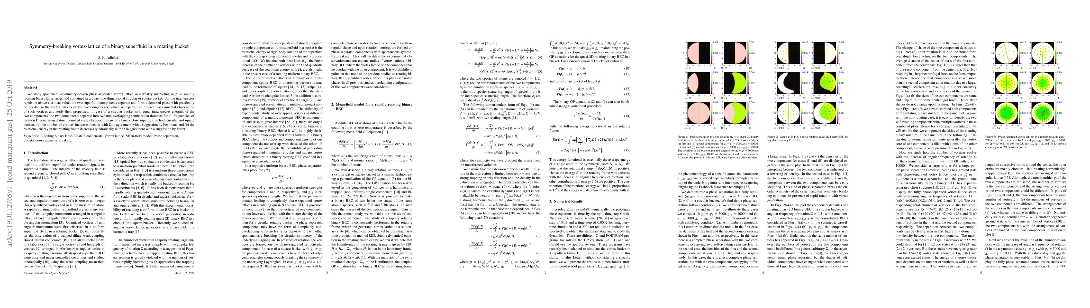 This study investigates the formation of a symmetry-breaking vortex lattice in a rapidly rotating binary Bose superfluid, showing that above a critical inter-species repulsion, the components phase-separate and form distinct vortex lattices. In circular buckets, the components form non-overlapping semicircular domains, while the vortex count increases linearly with rotation frequency and rotational energy decreases quadratically, aligning with theoretical predictions.