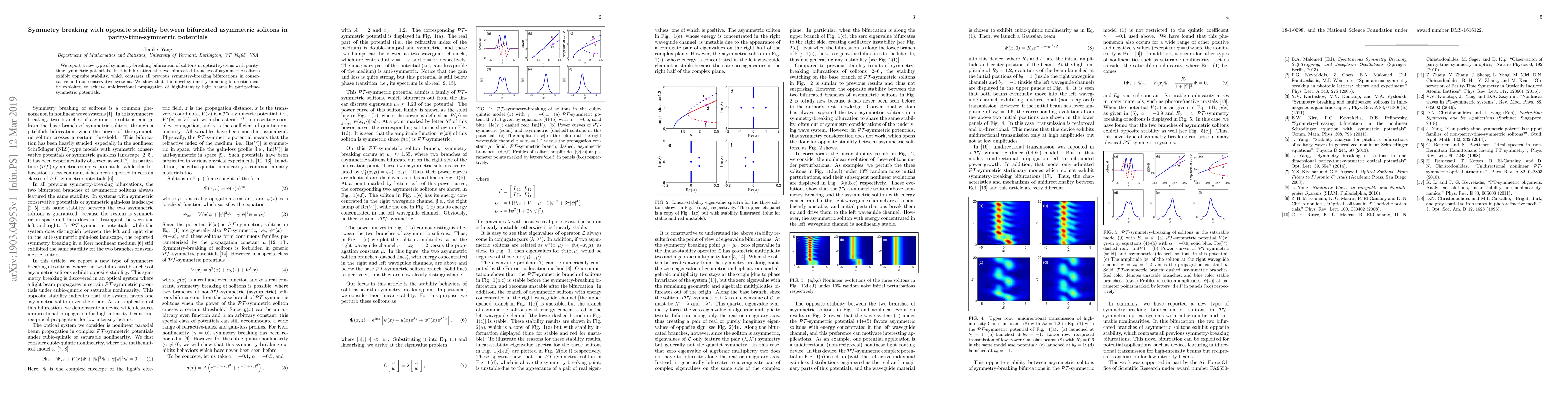 This paper reports a novel symmetry-breaking bifurcation of solitons in optical systems with parity-time-symmetric potentials, where bifurcated asymmetric solitons display opposite stability. This unique bifurcation enables unidirectional propagation of high-intensity light beams.