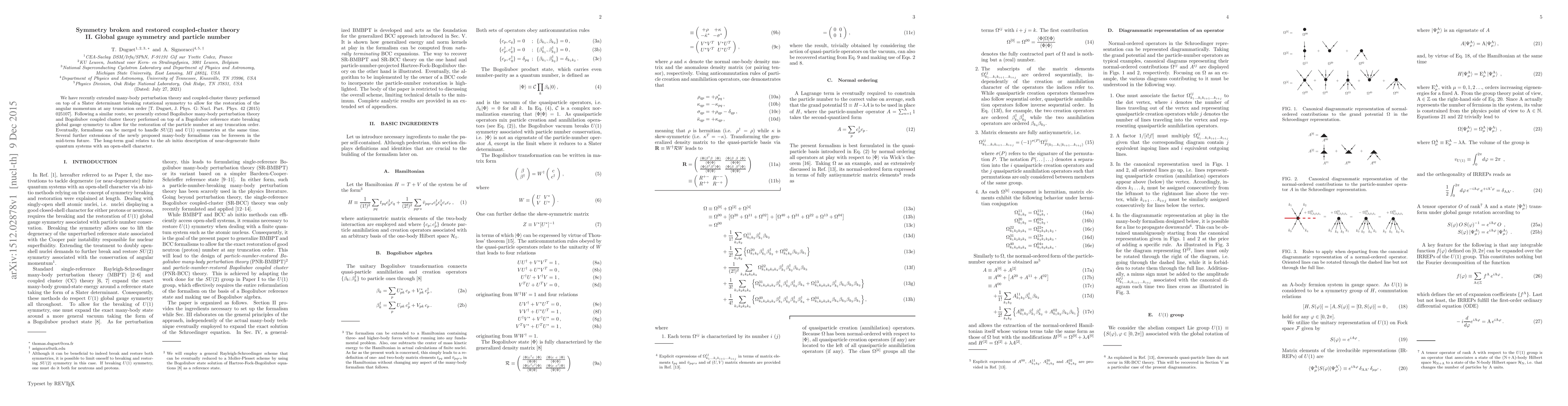 We have recently extended many-body perturbation theory and coupled-cluster theory performed on top of a Slater determinant breaking rotational symmetry to allow for the restoration of the angular momentum at any truncation order [T. Duguet, J. Phys. G: Nucl. Part. Phys. 42 (2015) 025107]. Following a similar route, we presently extend Bogoliubov many-body perturbation theory and Bogoliubov coupled cluster theory performed on top of a Bogoliubov reference state breaking global gauge symmetry to allow for the restoration of the particle number at any truncation order. Eventually, formalisms can be merged to handle $SU(2)$ and $U(1)$ symmetries at the same time. Several further extensions of the newly proposed many-body formalisms can be foreseen in the mid-term future. The long-term goal relates to the ab initio description of near-degenerate finite quantum systems with an open-shell character.