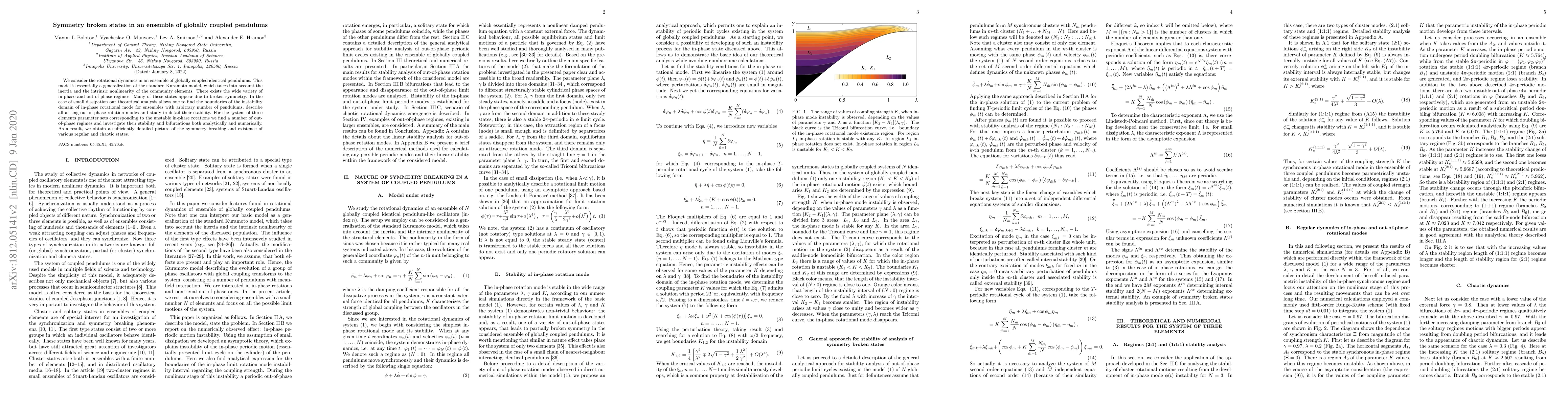 We consider the rotational dynamics in an ensemble of globally coupled identical pendulums. This model is essentially a generalization of the standard Kuramoto model, which takes into account the inertia and the intrinsic nonlinearity of the community elements. There exists the wide variety of in-phase and out-of-phase regimes. Many of these states appear due to broken symmetry. In the case of small dissipation our theoretical analysis allows one to find the boundaries of the instability domain of in-phase rotational mode for ensembles with arbitrary number of pendulums, describe all arising out-of-phase rotation modes and study in detail their stability. For the system of three elements parameter sets corresponding to the unstable in-phase rotations we find a number of out-of-phase regimes and investigate their stability and bifurcations both analytically and numerically. As a result, we obtain a sufficiently detailed picture of the symmetry breaking and existence of various regular and chaotic states.