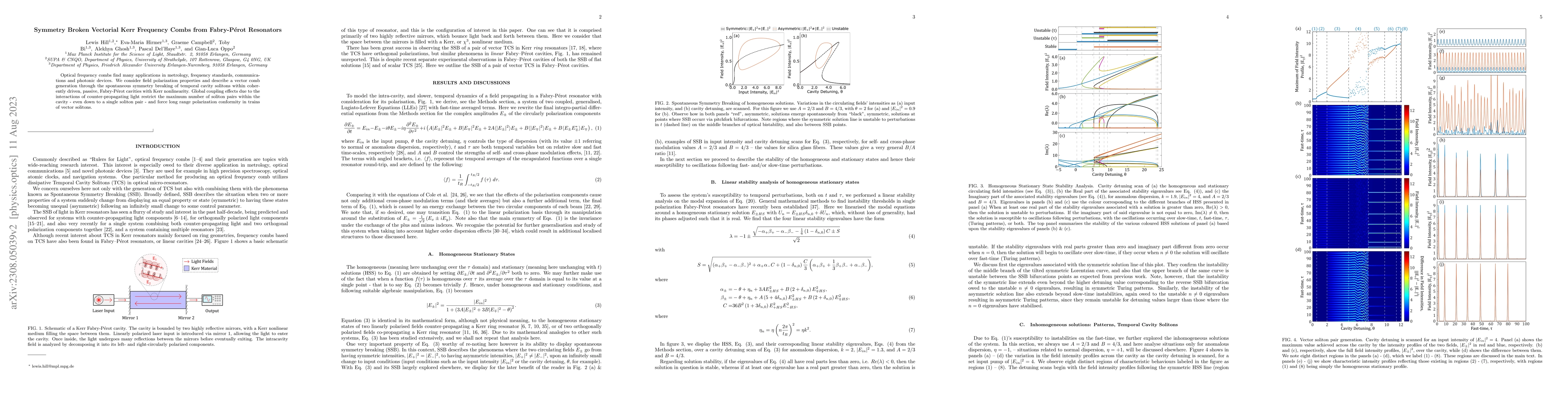 This paper explores the generation of vectorial Kerr frequency combs in Fabry-Pérot resonators through spontaneous symmetry breaking of temporal cavity solitons. The study highlights how global coupling effects limit soliton pairs and enforce long-range polarization conformity in the comb trains.