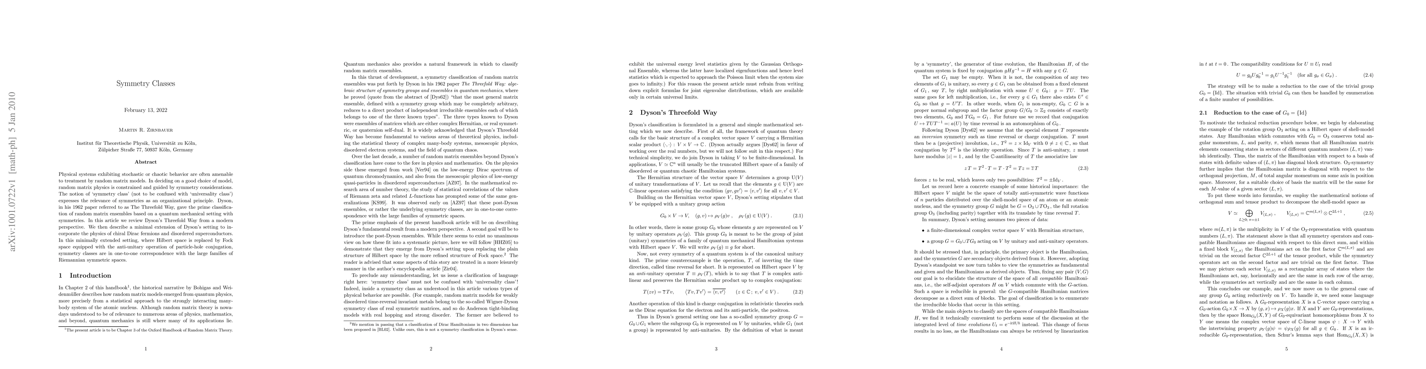Physical systems exhibiting stochastic or chaotic behavior are often amenable to treatment by random matrix models. In deciding on a good choice of model, random matrix physics is constrained and guided by symmetry considerations. The notion of 'symmetry class' (not to be confused with 'universality class') expresses the relevance of symmetries as an organizational principle. Dyson, in his 1962 paper referred to as the Threefold Way, gave the prime classification of random matrix ensembles based on a quantum mechanical setting with symmetries. In this article we review Dyson's Threefold Way from a modern perspective. We then describe a minimal extension of Dyson's setting to incorporate the physics of chiral Dirac fermions and disordered superconductors. In this minimally extended setting, where Hilbert space is replaced by Fock space equipped with the anti-unitary operation of particle-hole conjugation, symmetry classes are in one-to-one correspondence with the large families of Riemannian symmetric spaces.