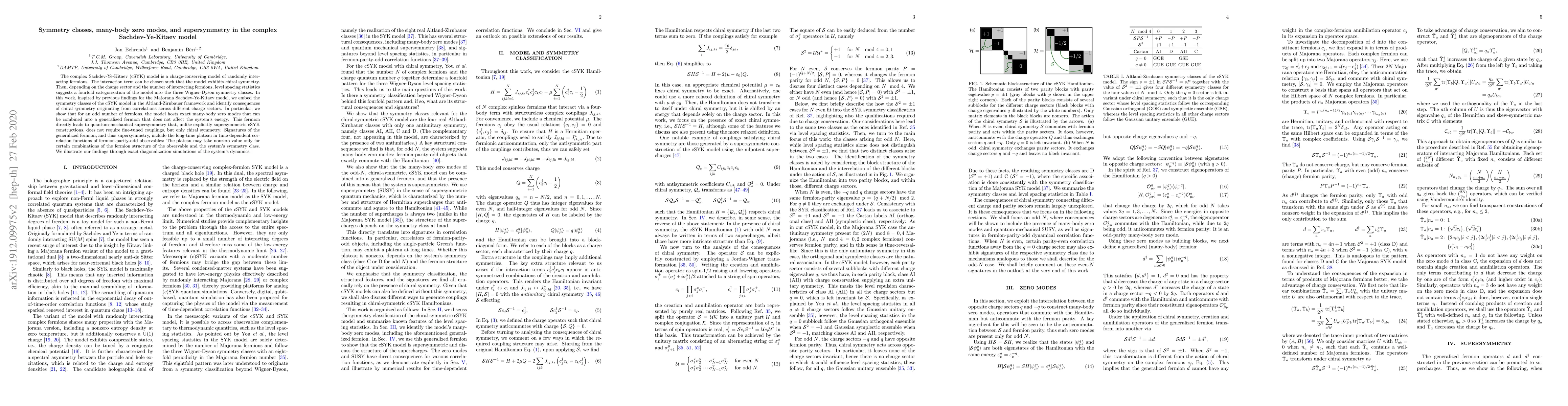 The paper explores the complex Sachdev-Ye-Kitaev model's symmetry classes and identifies many-body zero modes, leading to spontaneous quantum-mechanical supersymmetry via chiral symmetry without fine-tuned couplings. Signatures include long-time plateaus in time-dependent correlation functions, demonstrated via simulations.