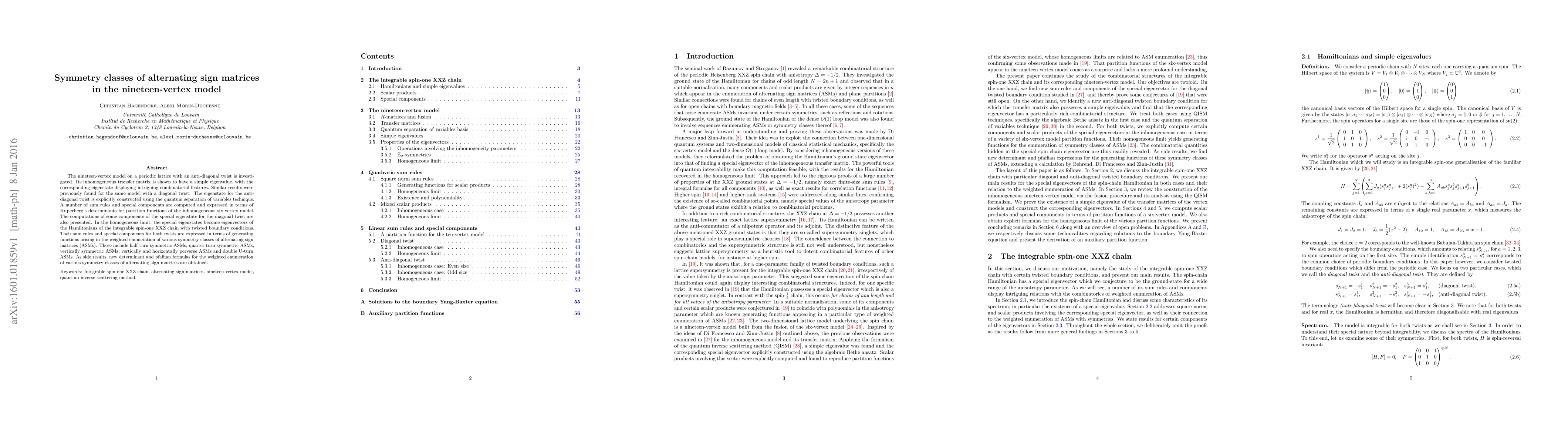 This paper investigates the nineteen-vertex model with an anti-diagonal twist, constructing its eigenstate using quantum separation of variables and deriving sum rules linked to Kuperberg's determinants. It relates the special eigenstates in the homogeneous limit to the Hamiltonians of the integrable spin-one XXZ chain, and ties these results to various symmetry classes of alternating sign matrices, including new determinant and pfaffian formulas.
