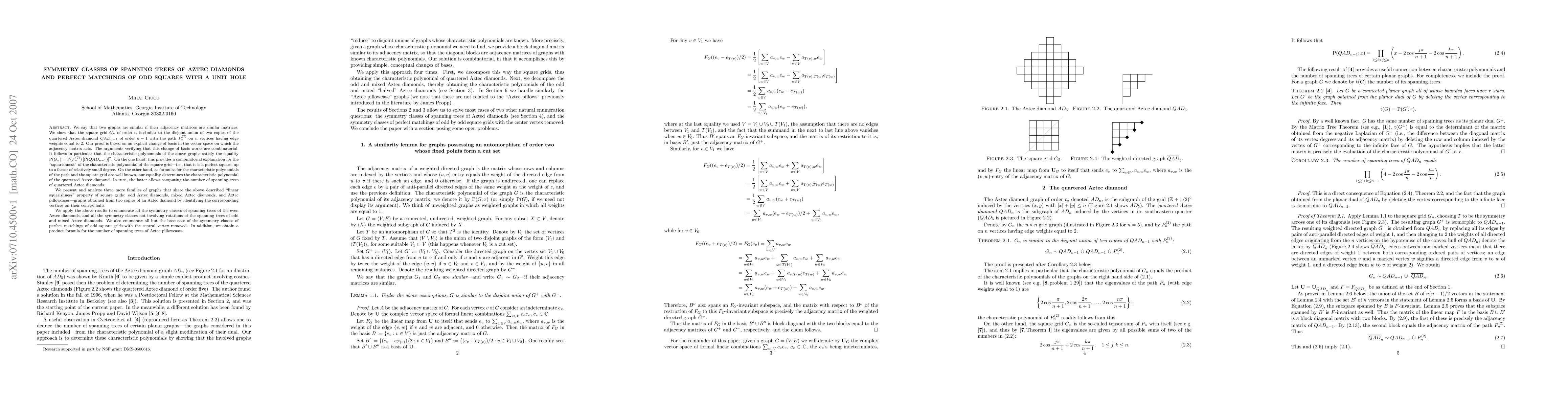 We say that two graphs are similar if their adjacency matrices are similar matrices. We show that the square grid $G_n$ of order $n$ is similar to the disjoint union of two copies of the quartered Aztec diamond $QAD_{n-1}$ of order $n-1$ with the path $P_n^{(2)}$ on $n$ vertices having edge weights equal to~2. Our proof is based on an explicit change of basis in the vector space on which the adjacency matrix acts. The arguments verifying that this change of basis works are combinatorial. In particular, this allows computing the number of spanning trees of quartered Aztec diamonds. We present and analyze three more families of graphs that share the above described ``linear squarishness'' property of square grids: odd Aztec diamonds, mixed Aztec diamonds, and Aztec pillowcases--graphs obtained from two copies of an Aztec diamond by identifying the corresponding vertices on their convex hulls. We apply the above results to enumerate all the symmetry classes of spanning trees of the even Aztec diamonds, and all the symmetry classes not involving rotations of the spanning trees of odd and mixed Aztec diamonds. We also enumerate all but the base case of the symmetry classes of perfect matchings of odd square grids with the central vertex removed. In addition, we obtain a product formula for the number of spanning trees of Aztec pillowcases.