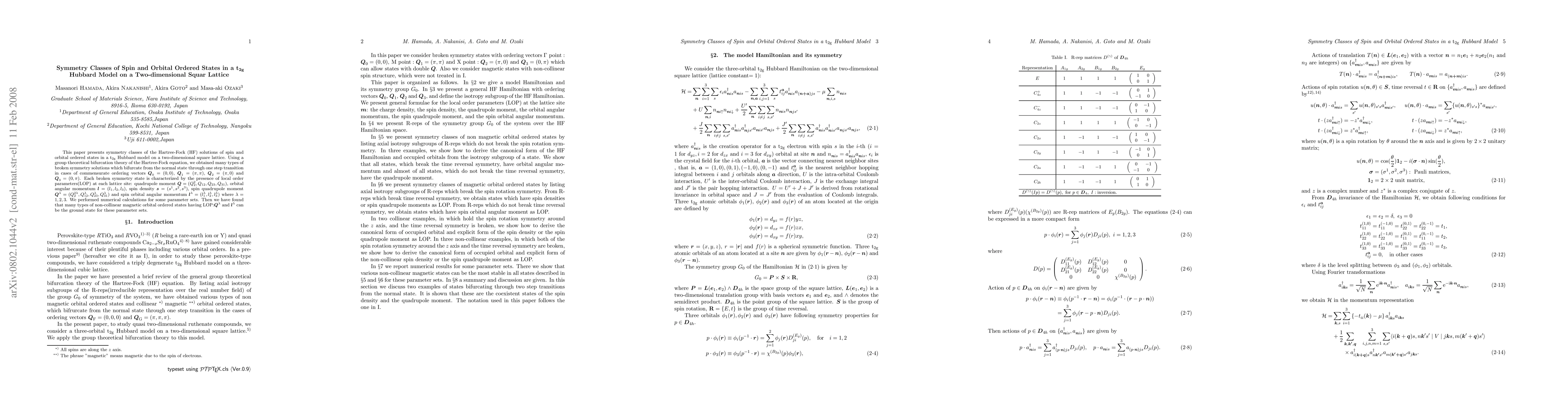 This paper explores the symmetry classes of spin and orbital ordered states in a t_{2g} Hubbard model on a two-dimensional square lattice, identifying various broken symmetry solutions via group theoretical bifurcation theory. Numerical calculations reveal that non-collinear magnetic orbital ordered states can be the ground state for certain parameter sets.