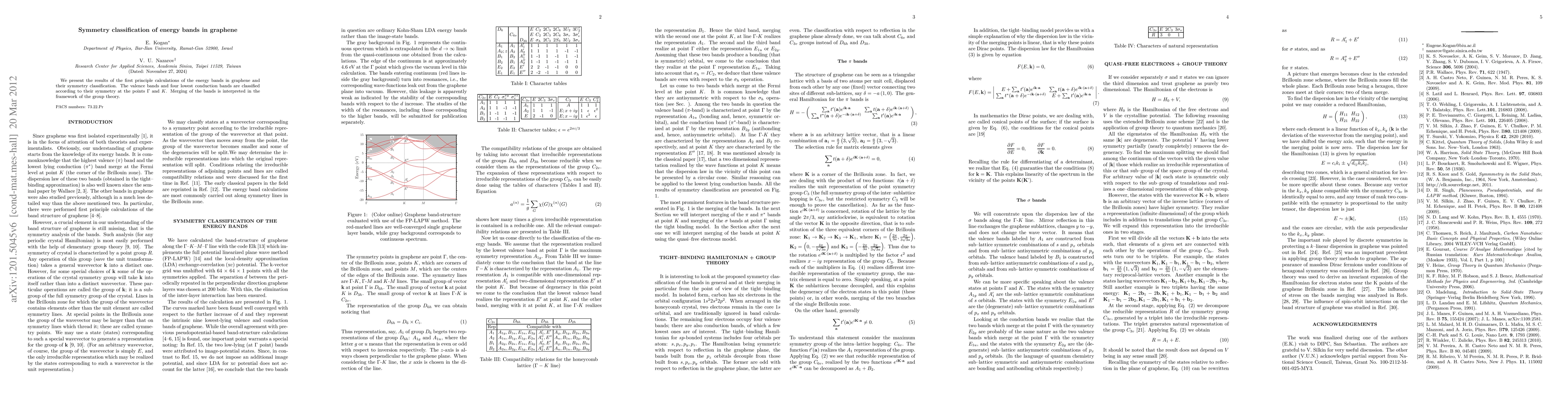 Summary: This paper uses first-principle calculations to classify the energy bands in graphene based on symmetry at key points, interpreting band merging through group theory. The focus is on valence and conduction bands up to the fourth level.