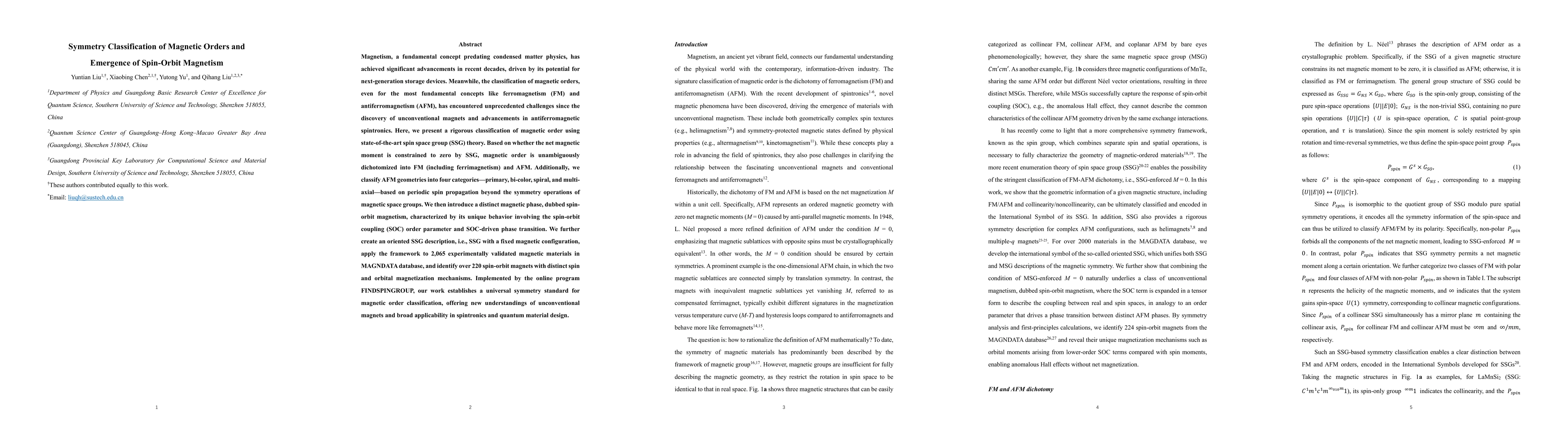 Magnetism, a fundamental concept predating condensed matter physics, has achieved significant advancements in recent decades, driven by its potential for next-generation storage devices. Meanwhile, the classification of magnetic orders, even for the most fundamental concepts like ferromagnetism (FM) and antiferromagnetism (AFM), has encountered unprecedented challenges since the discovery of unconventional magnets and advancements in antiferromagnetic spintronics. Here, we present a rigorous classification of magnetic order using state-of-the-art spin space group (SSG) theory. Based on whether the net magnetic moment is constrained to zero by SSG, magnetic order is unambiguously dichotomized into FM (including ferrimagnetism) and AFM. Additionally, we classify AFM geometries into four categories -- primary, bi-color, spiral, and multi-axial -- based on periodic spin propagation beyond the symmetry operations of magnetic space groups. We then introduce a distinct magnetic phase, dubbed spin-orbit magnetism, characterized by its unique behavior involving the spin-orbit coupling (SOC) order parameter and SOC-driven phase transition. We further create an oriented SSG description, i.e., SSG with a fixed magnetic configuration, apply the framework to 2,065 experimentally validated magnetic materials in MAGNDATA database, and identify over 220 spin-orbit magnets with distinct spin and orbital magnetization mechanisms. Implemented by the online program FINDSPINGROUP, our work establishes a universal symmetry standard for magnetic order classification, offering new understandings of unconventional magnets and broad applicability in spintronics and quantum material design.