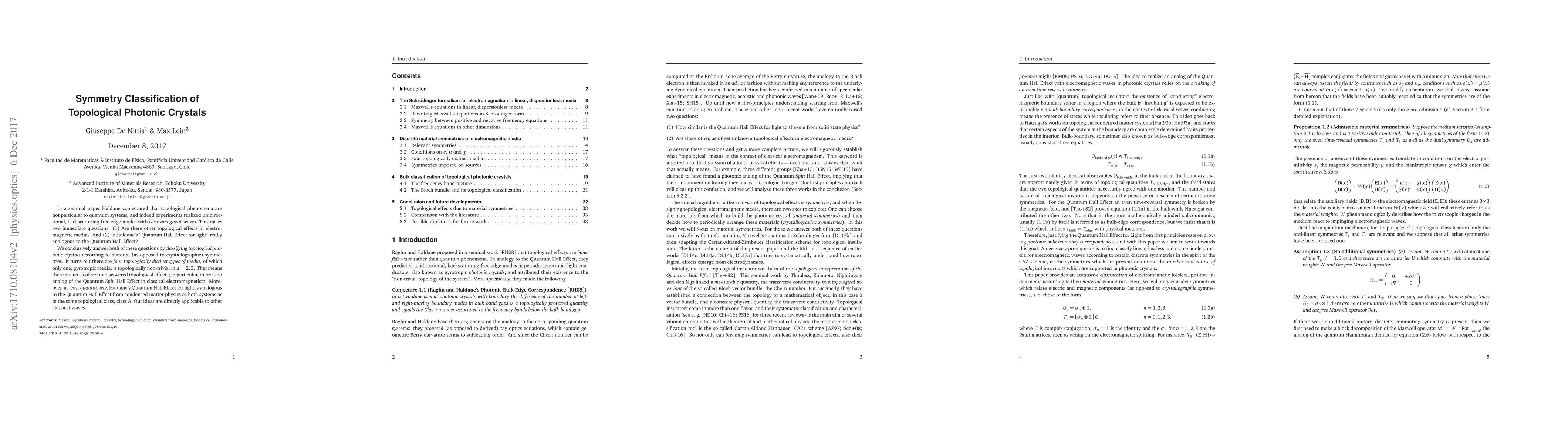 This research classifies topological photonic crystals into four types based on material symmetries, revealing no undiscovered topological effects in classical electmagnetism and confirming the analogy between Haldane's Quantum Hall Effect for light and the Quantum Hall Effect in condensed matter physics.