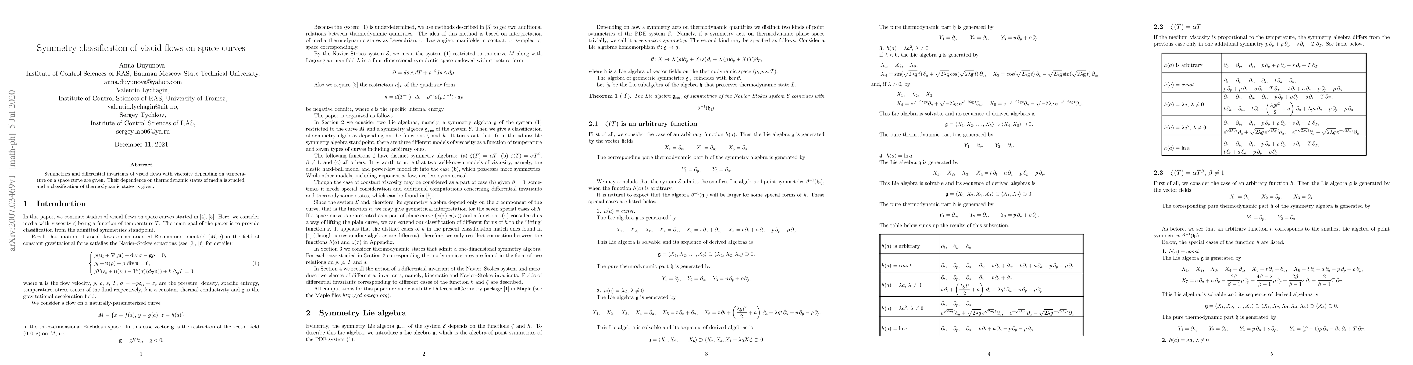 Symmetries and differential invariants of viscid flows with viscosity depending on temperature on a space curve are given. Their dependence on thermodynamic states of media is studied, and a classification of thermodynamic states is given.