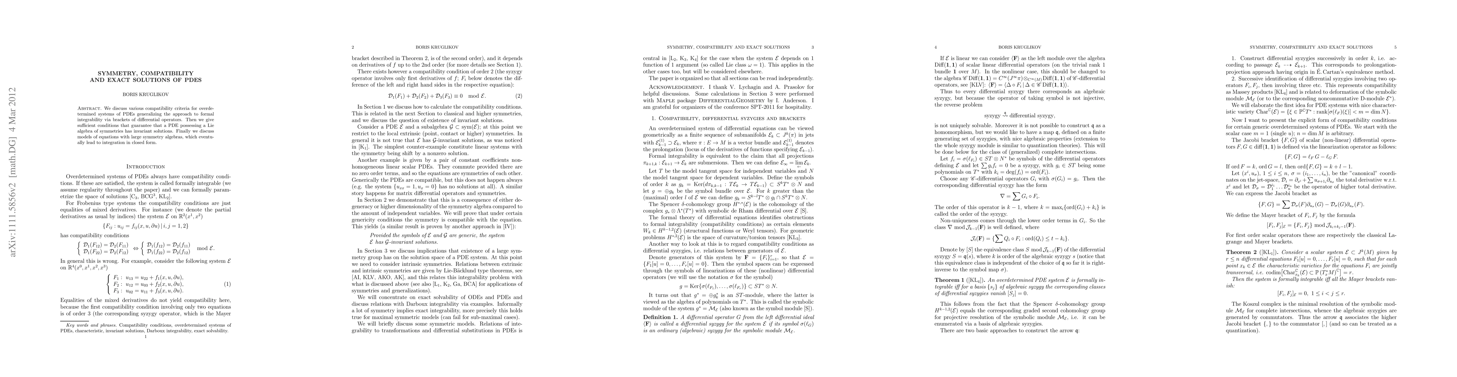 We discuss various compatibility criteria for overdetermined systems of PDEs generalizing the approach to formal integrability via brackets of differential operators. Then we give sufficient conditions that guarantee that a PDE possessing a Lie algebra of symmetries has invariant solutions with respect to this Lie algebra. These conditions hold for generic=nondegenerate pairs (equation,symmetry) in certain dimension range for the Lie algebra. Finally we discuss models of equations with large symmetry algebras, which eventually lead to integration in closed form.