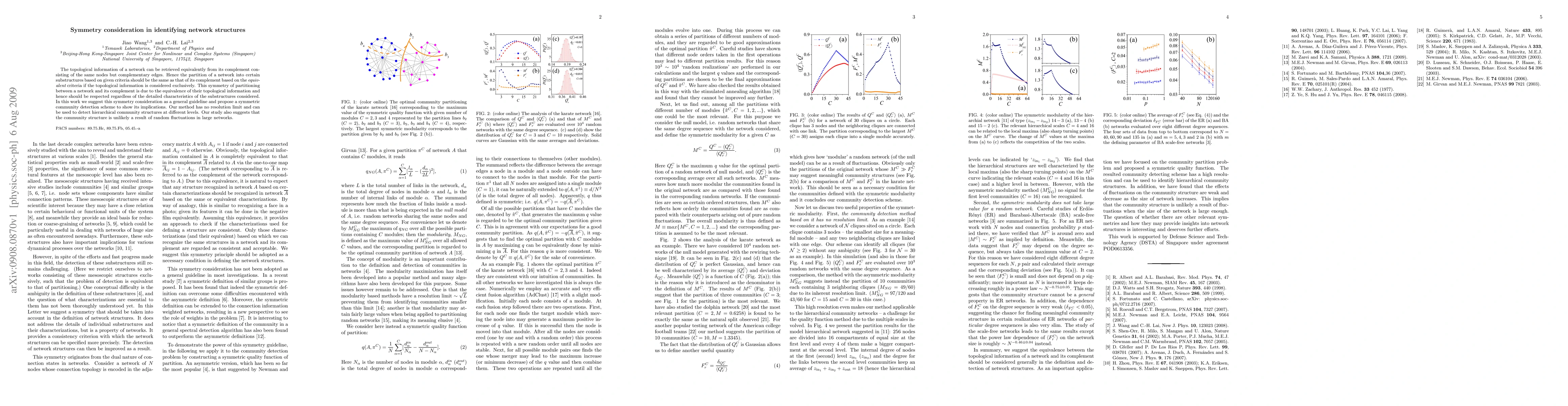 The topological information of a network can be retrieved equivalently from its complement consisting of the same nodes but complementary edges. Hence the partition of a network into certain substructures based on given criteria should be the same as that of its complement based on the equivalent criteria if the topological information is considered exclusively. This symmetry of partitioning between a network and its complement is due to the equivalence of their topological information and hence should be respected regardless of the detailed characteristics of the substructures considered. In this work we suggest this symmetry consideration as a general guideline and propose a symmetric community detection scheme to show its implications. Our method has no resolution limit and can be used to detect hierarchical community structures at different levels. Our study also suggests that the community structure is unlikely a result of random fluctuations in large networks.