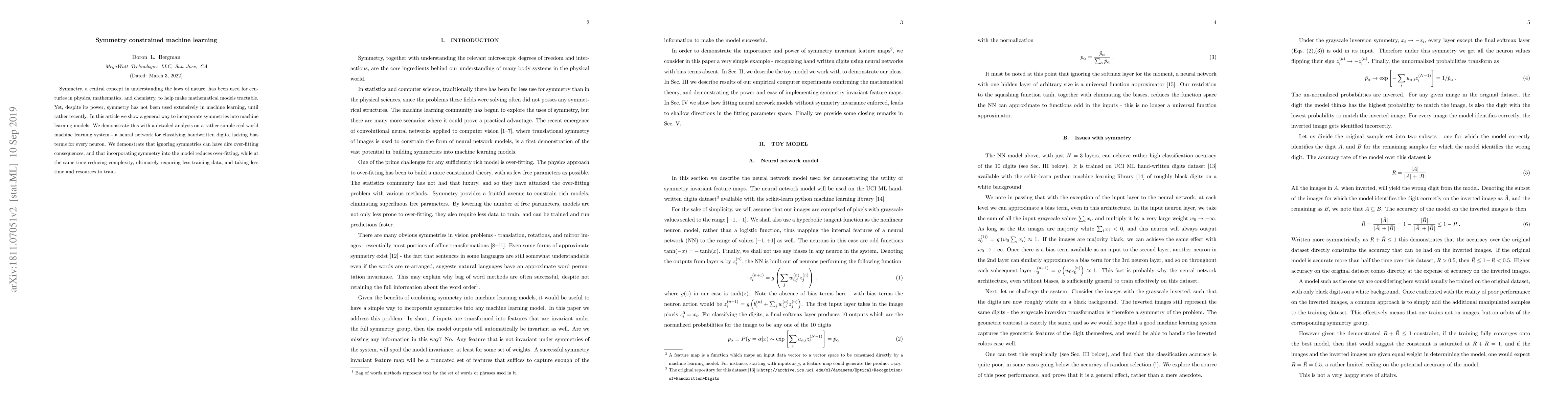 Symmetry, a central concept in understanding the laws of nature, has been used for centuries in physics, mathematics, and chemistry, to help make mathematical models tractable. Yet, despite its power, symmetry has not been used extensively in machine learning, until rather recently. In this article we show a general way to incorporate symmetries into machine learning models. We demonstrate this with a detailed analysis on a rather simple real world machine learning system - a neural network for classifying handwritten digits, lacking bias terms for every neuron. We demonstrate that ignoring symmetries can have dire over-fitting consequences, and that incorporating symmetry into the model reduces over-fitting, while at the same time reducing complexity, ultimately requiring less training data, and taking less time and resources to train.