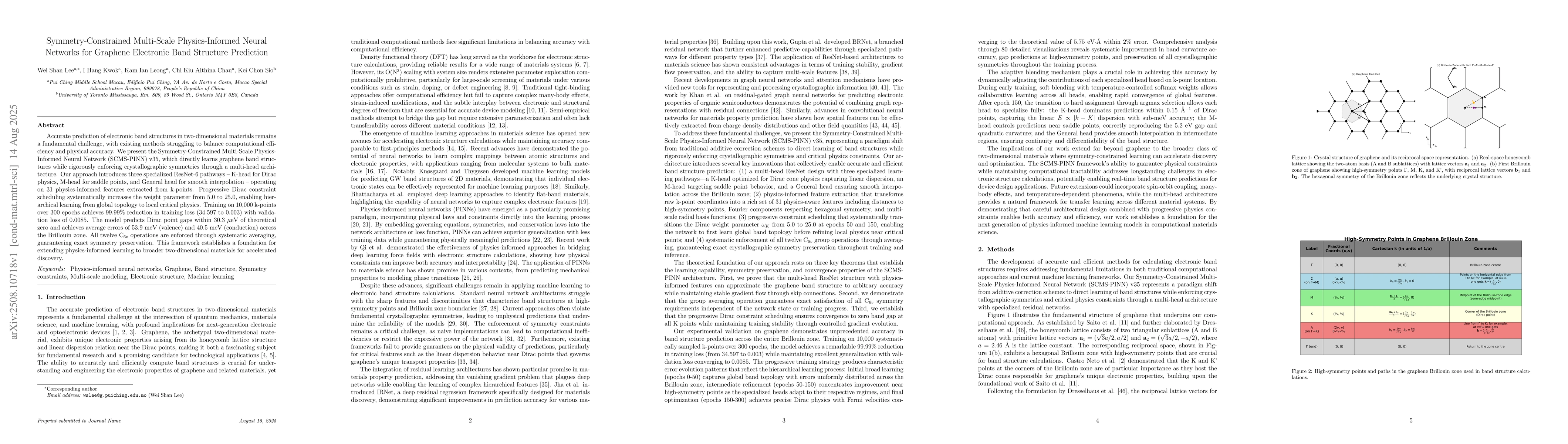 This research introduces Symmetry-Constrained Multi-Scale Physics-Informed Neural Networks (SCMS-PINN) to accurately predict graphene's electronic band structures. By enforcing crystallographic symmetries with a multi-head architecture and specialized ResNet pathways, the model achieves a 99.99% reduction in training loss, preserving all C6v symmetries. It predicts Dirac point gaps within 30.3 μeV of theoretical zero and demonstrates average errors of 53.9 meV (valence) and 40.5 meV (conduction). This framework paves the way for applying physics-informed learning to other 2D materials for faster material discovery.