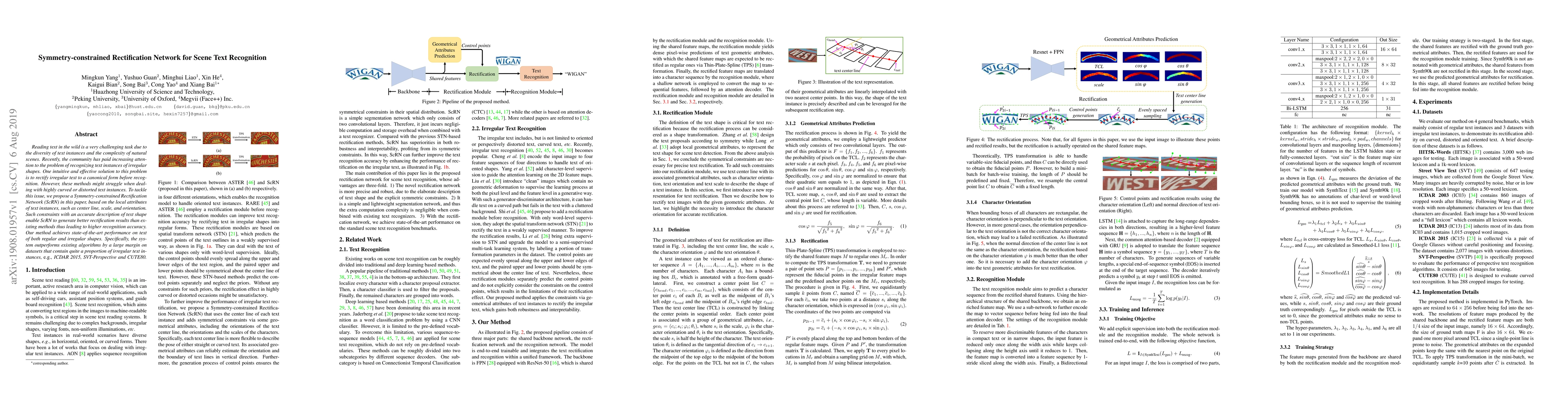 This paper introduces a Symmetry-constrained Rectification Network (ScRN) to improve the recognition of irregularly shaped text by rectifying it to a canonical form, achieving state-of-the-art performance on datasets with complex, distorted text instances. The method leverages local text attributes for better rectification results, leading to higher recognition accuracy.