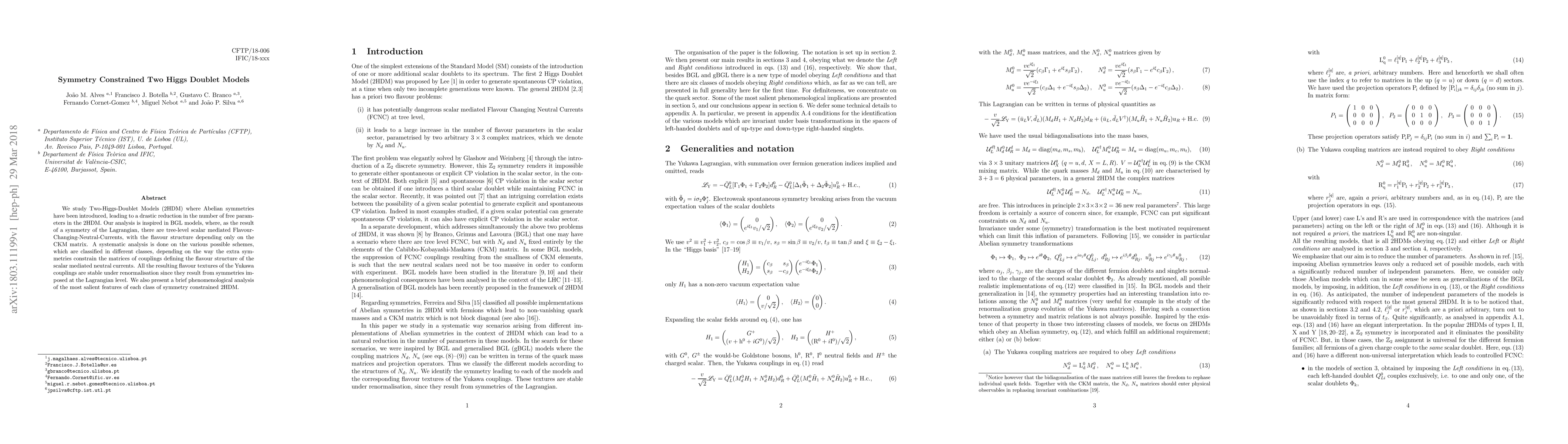 We study Two-Higgs-Doublet Models (2HDM) where Abelian symmetries have been introduced, leading to a drastic reduction in the number of free parameters in the 2HDM. Our analysis is inspired in BGL models, where, as the result of a symmetry of the Lagrangian, there are tree-level scalar mediated Flavour-Changing-Neutral-Currents, with the flavour structure depending only on the CKM matrix. A systematic analysis is done on the various possible schemes, which are classified in different classes, depending on the way the extra symmetries constrain the matrices of couplings defining the flavour structure of the scalar mediated neutral currents. All the resulting flavour textures of the Yukawa couplings are stable under renormalisation since they result from symmetries imposed at the Lagrangian level. We also present a brief phenomenological analysis of the most salient features of each class of symmetry constrained 2HDM.