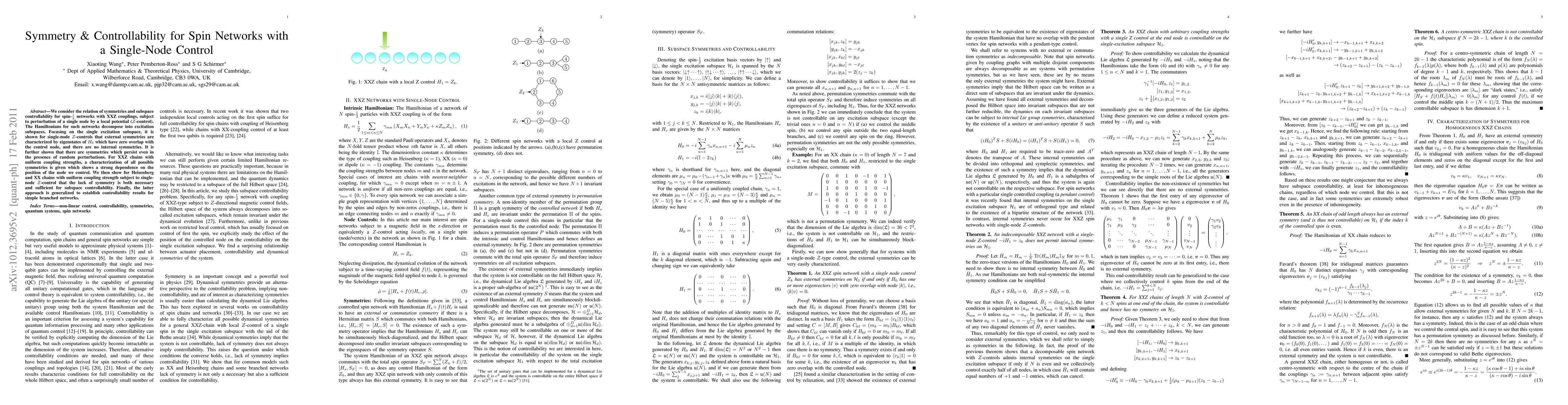 We consider the relation of symmetries and subspace controllability for spin networks with XXZ coupling subject to control of a single node by a local potential (Z-control). Such networks decompose into excitation subspaces. Focusing on the single excitation subspace it is shown that for single-node Z-controls external symmetries are characterized by eigenstates of the system Hamiltonian that have zero overlap with the control node, and there are no internal symmetries. It is further shown that there are symmetries that persist even in the presence of random perturbations. For uniformly coupled XXZ chains a characterization of all possible symmetries is given, which shows a strong dependence on the position of the node we control. Finally, it is shown rigorously for uniform Heisenberg and XX chains subject to single-node Z-control that the lack of symmetry is not only necessary but sufficient for subspace controllability. The latter approach is then generalized to establish controllability results for simple branched networks.