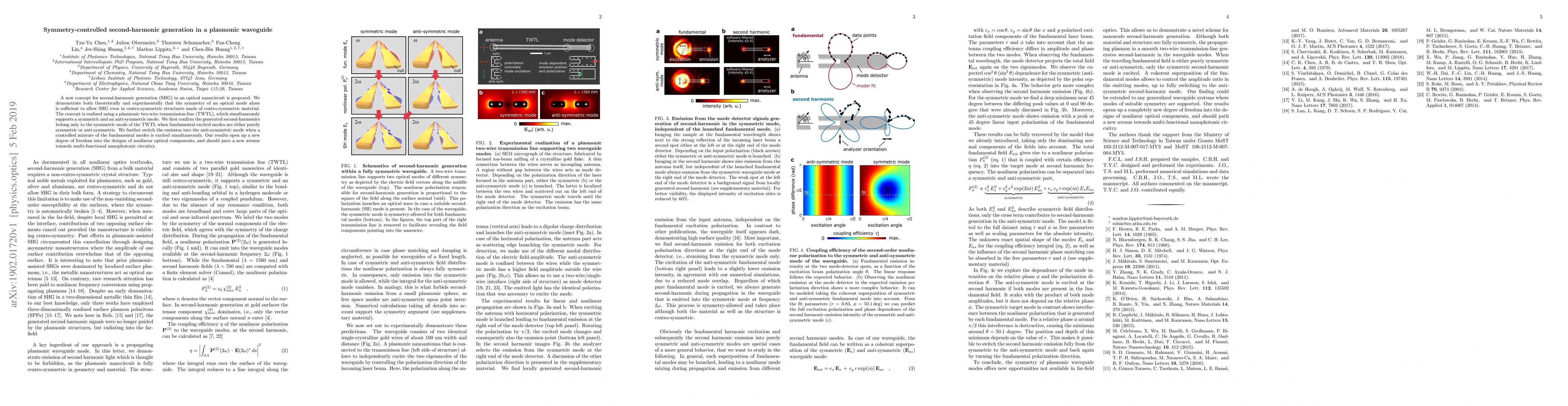A new concept for second-harmonic generation (SHG) in an optical nanocircuit is proposed. We demonstrate both theoretically and experimentally that the symmetry of an optical mode alone is sufficient to allow SHG even in centro-symmetric structures made of centro-symmetric material. The concept is realized using a plasmonic two-wire transmission-line (TWTL), which simultaneously supports a symmetric and an anti-symmetric mode. We first confirm the generated second-harmonics belong only to the symmetric mode of the TWTL when fundamental excited modes are either purely symmetric or anti-symmetric. We further switch the emission into the anti-symmetric mode when a controlled mixture of the fundamental modes is excited simultaneously. Our results open up a new degree of freedom into the designs of nonlinear optical components, and should pave a new avenue towards multi-functional nanophotonic circuitry.