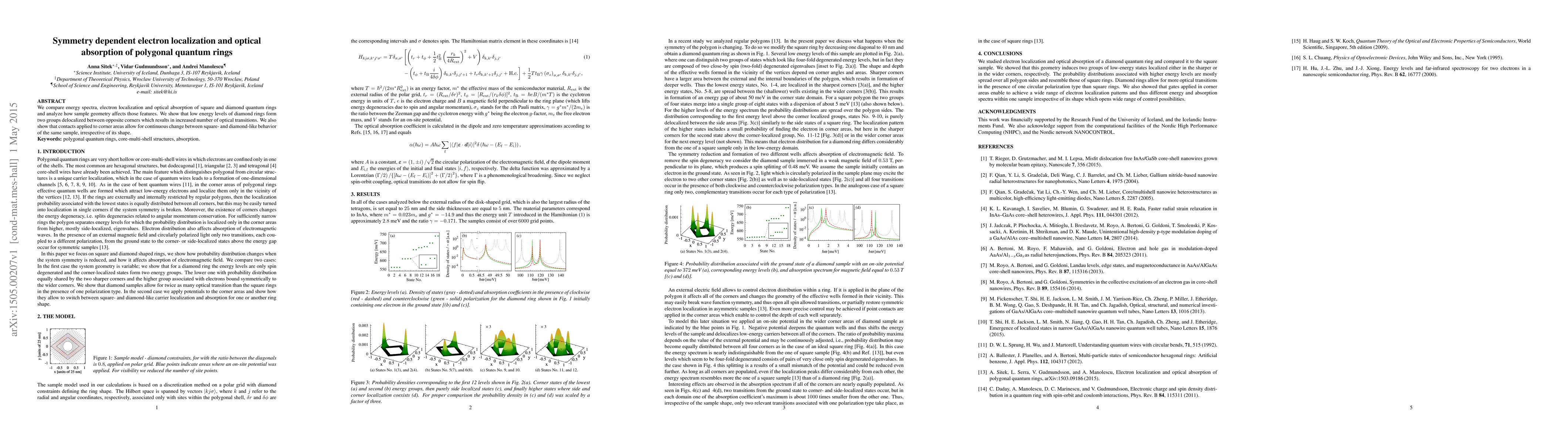We compare energy spectra, electron localization and optical absorption of square and diamond quantum rings and analyze how sample geometry affects those features. We show that low energy levels of diamond rings form two groups delocalized between opposite corners which results in increased number of optical transitions. We also show that contacts applied to corner areas allow for continuous change between square- and diamond-like behavior of the same sample, irrespective of its shape.