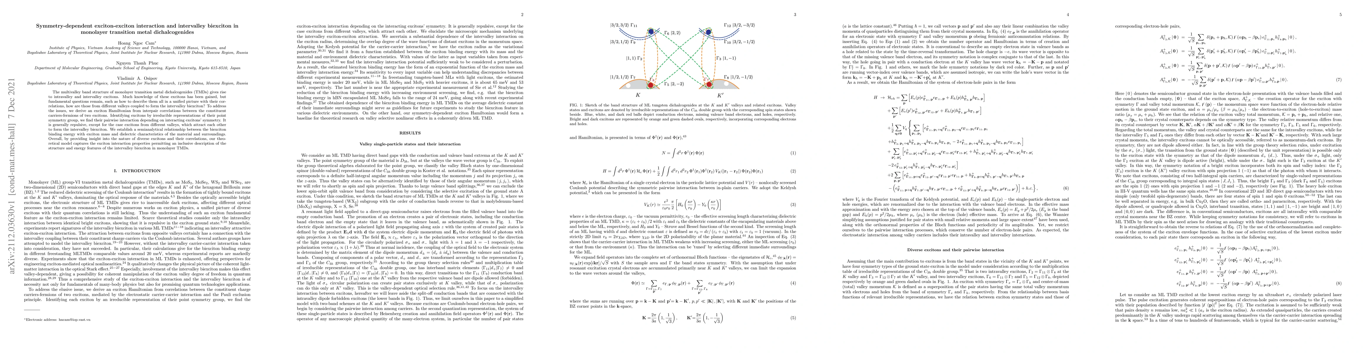 The multivalley band structure of monolayer transition metal dichalcogenides (TMDs) gives rise to intravalley and intervalley excitons. Much knowledge of these excitons has been gained, but fundamental questions remain, such as how to describe them all in a unified picture with their correlations, how are those from different valleys coupled to form the intervalley biexciton? To address the issues, we derive an exciton Hamiltonian from interpair correlations between the constituent carriers-fermions of two excitons. Identifying excitons by irreducible representations of their point symmetry group, we find their pairwise interaction depending on interacting excitons' symmetry. It is generally repulsive, except for the case excitons from different valleys, which attract each other to form the intervalley biexciton. We establish a semianalytical relationship between the biexciton binding energy with exciton mass and dielectric characteristics of the material and surroundings. Overall, by providing insight into the nature of diverse excitons and their correlations, our theoretical model captures the exciton interaction properties permitting an inclusive description of the structure and energy features of the intervalley biexciton in monolayer TMDs.21