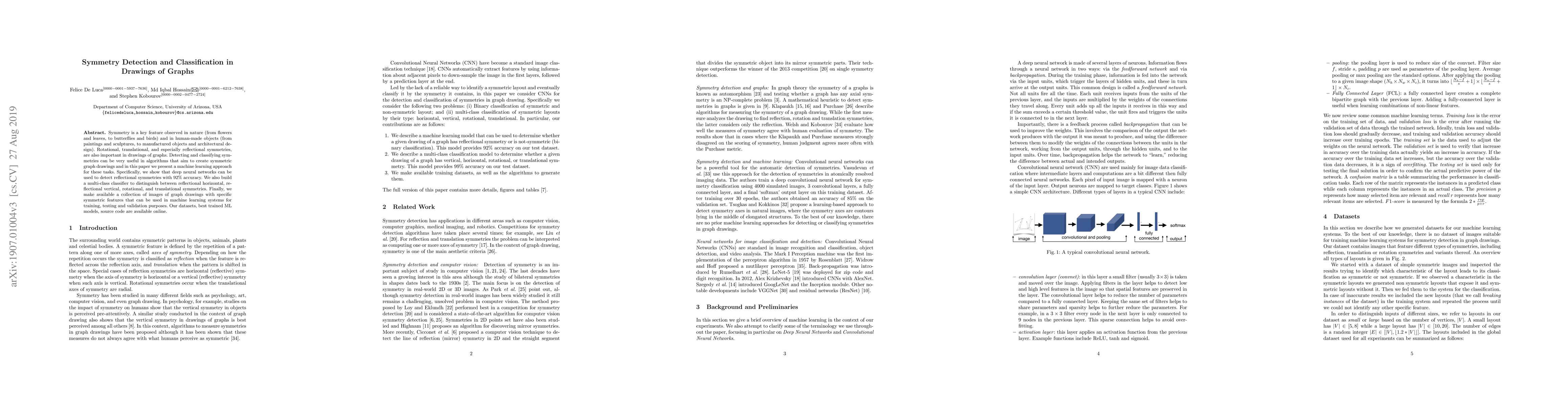 This paper presents a machine learning approach for detecting and classifying various symmetries in graph drawings using deep neural networks, achieving 92% accuracy in detecting reflectional symmetries. It also introduces a multi-class classifier for distinguishing between reflectional, rotational, and translational symmetries, and provides a dataset for training and validation.