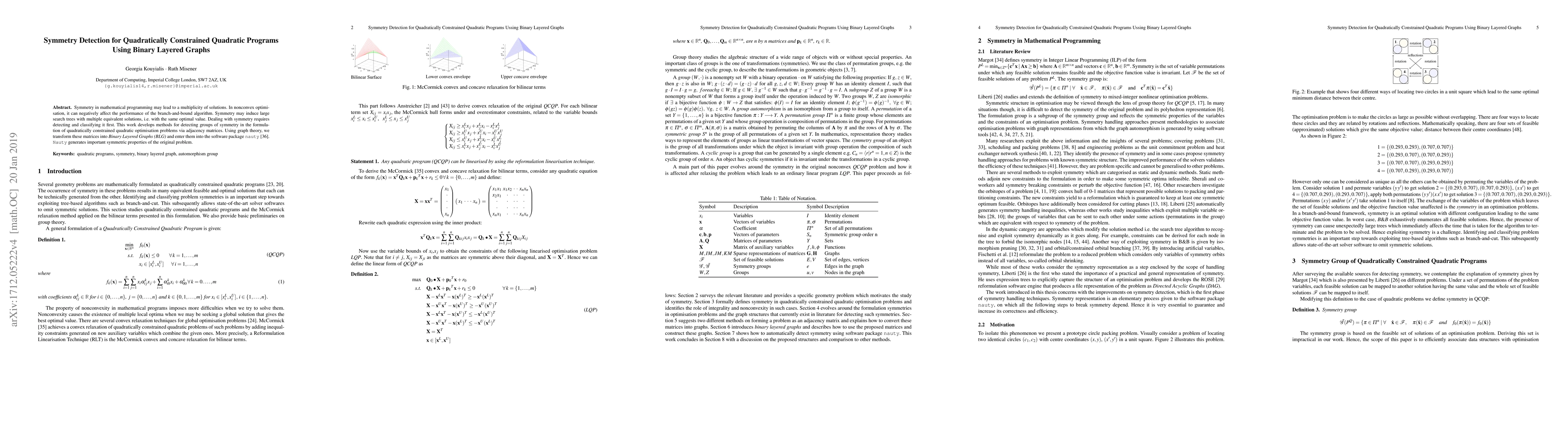 Symmetry in mathematical programming may lead to a multiplicity of solutions. In nonconvex optimisation, it can negatively affect the performance of the branch-and-bound algorithm. Symmetry may induce large search trees with multiple equivalent solutions, i.e. with the same optimal value. Dealing with symmetry requires detecting and classifying it first. This work develops methods for detecting groups of symmetry in the formulation of quadratically constrained quadratic optimisation problems via adjacency matrices. Using graph theory, we transform these matrices into Binary Layered Graphs (BLG) and enter them into the software package nauty. Nauty generates important symmetric properties of the original problem.