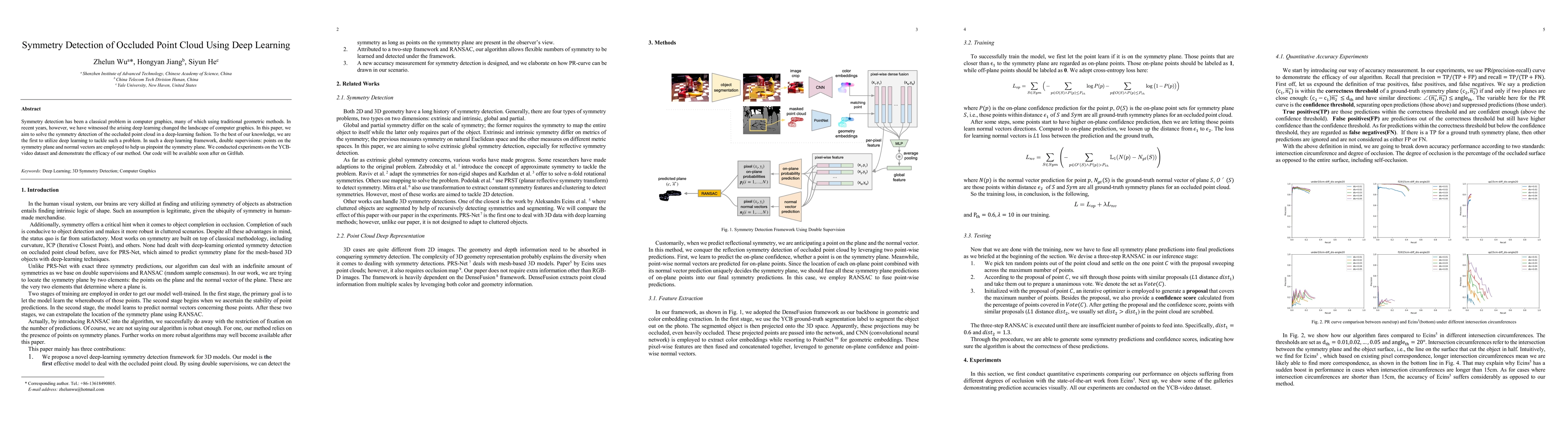 This paper introduces a deep learning method for detecting symmetry in occluded point clouds, achieving better results than traditional geometric methods on the YCB video dataset.