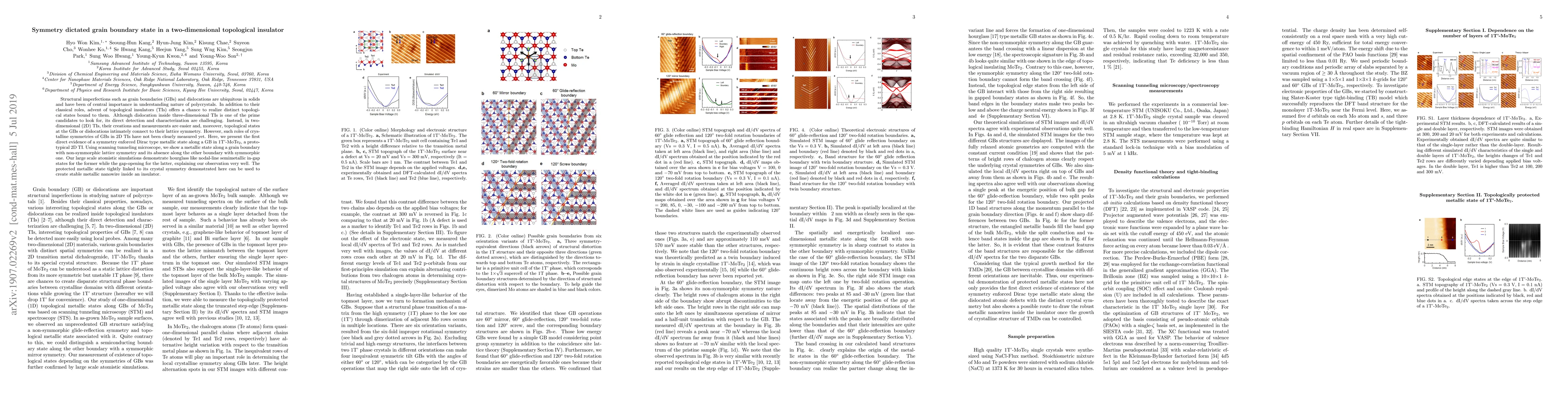 Structural imperfections such as grain boundaries (GBs) and dislocations are ubiquitous in solids and have been of central importance in understanding nature of polycrystals. In addition to their classical roles, advent of topological insulators (TIs) offers a chance to realize distinct topological states bound to them. Although dislocation inside three-dimensional TIs is one of the prime candidates to look for, its direct detection and characterization are challenging. Instead, in two-dimensional (2D) TIs, their creations and measurements are easier and, moreover, topological states at the GBs or dislocations intimately connect to their lattice symmetry. However, such roles of crystalline symmetries of GBs in 2D TIs have not been clearly measured yet. Here, we present the first direct evidence of a symmetry enforced Dirac type metallic state along a GB in 1T'-MoTe$_2$, a prototypical 2D TI. Using scanning tunneling microscope, we show a metallic state along a grain boundary with non-symmorphic lattice symmetry and its absence along the other boundary with symmorphic one. Our large scale atomistic simulations demonstrate hourglass like nodal-line semimetallic in-gap states for the former while the gap-opening for the latter, explaining our observation very well. The protected metallic state tightly linked to its crystal symmetry demonstrated here can be used to create stable metallic nanowire inside an insulator.