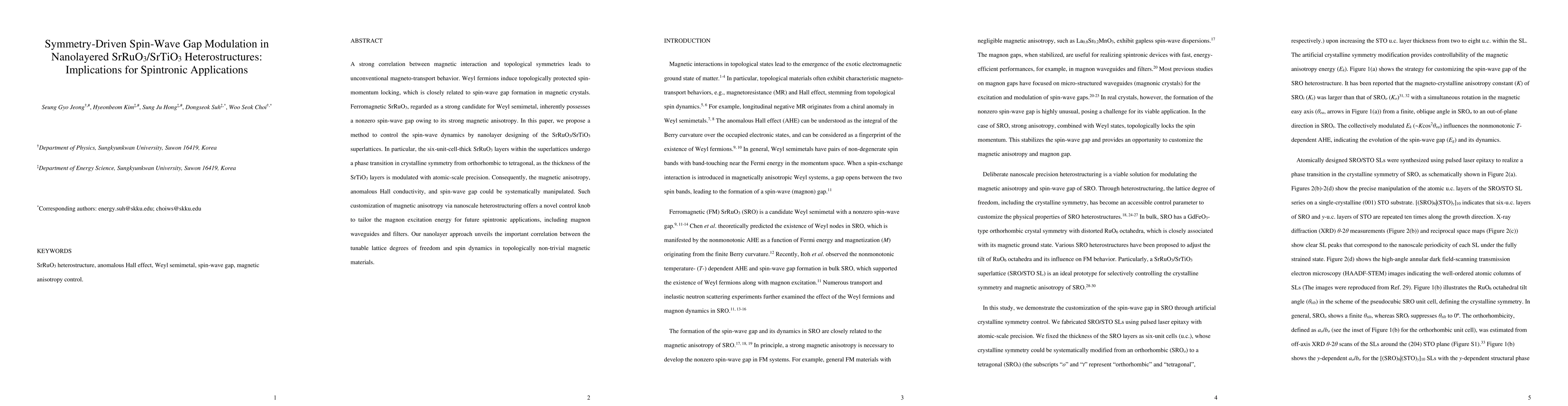 This paper explores how nanolayer design in SrRuO3/SrTiO3 superlattices can modulate spin-wave dynamics through symmetry-driven phase transitions, enabling control over magnetic anisotropy and spin-wave gap. This approach offers a new method to tailor magnon excitation energy for advanced spintronic applications.