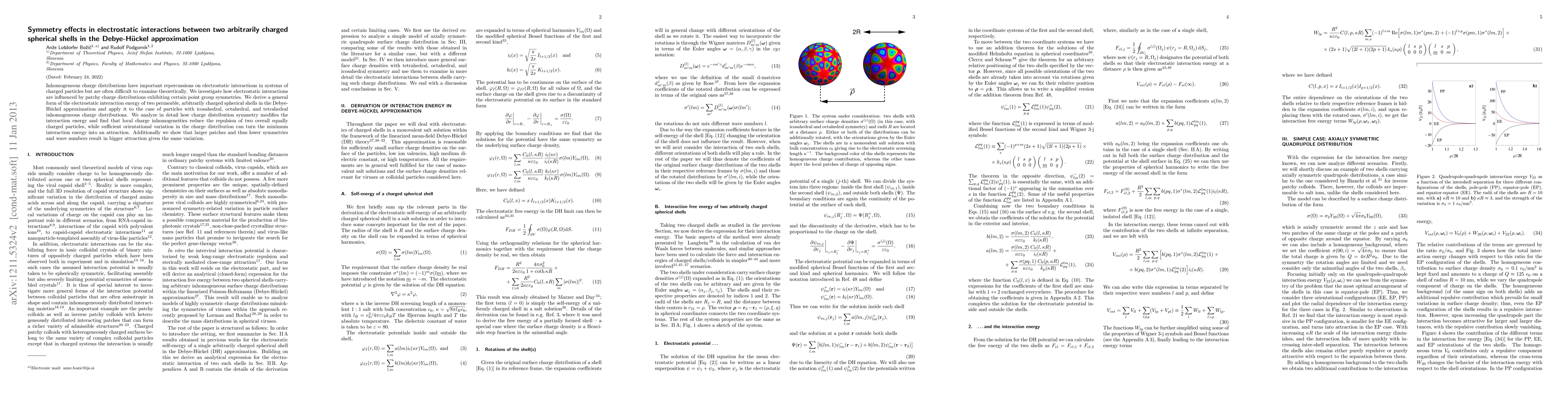 This paper examines how symmetry in patchy charge distributions affects electrostatic interactions between two charged spherical shells using the Debye-Hückel approximation. It reveals that local charge inhomogeneities can reduce repulsion and that sufficient orientational variation in charge distribution can induce attraction, with larger patches leading to stronger attraction.